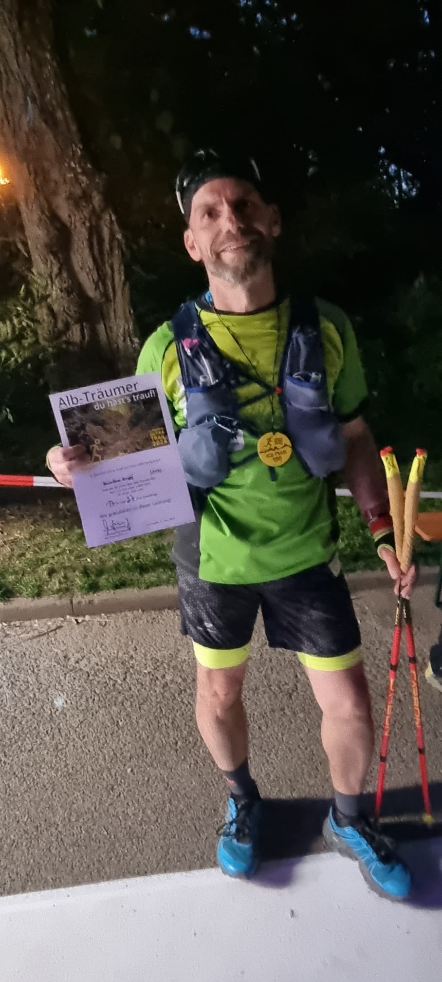 Auch Gunther und Kalle hatten jeweils mehrfach mit körperlichen Tiefpunkten zu kämpfen. Doch die beiden erfahrenen Ultra-Läufer konnten in diesen Phasen immer wieder die letzten Kräfte mobilisieren, ihren Lauf fortsetzen und es doch noch ins Ziel schaffen. Gunther tatsächlich mit Einbruch der Dunkelheit um 21.27 Uhr als 24. der Gesamtwertung. Kalle musste auf den letzten Kilometern doch noch die Stirnlampe aufsetzen und lief um 22:19 Uhr auf Rang 31 im Ziel ein.