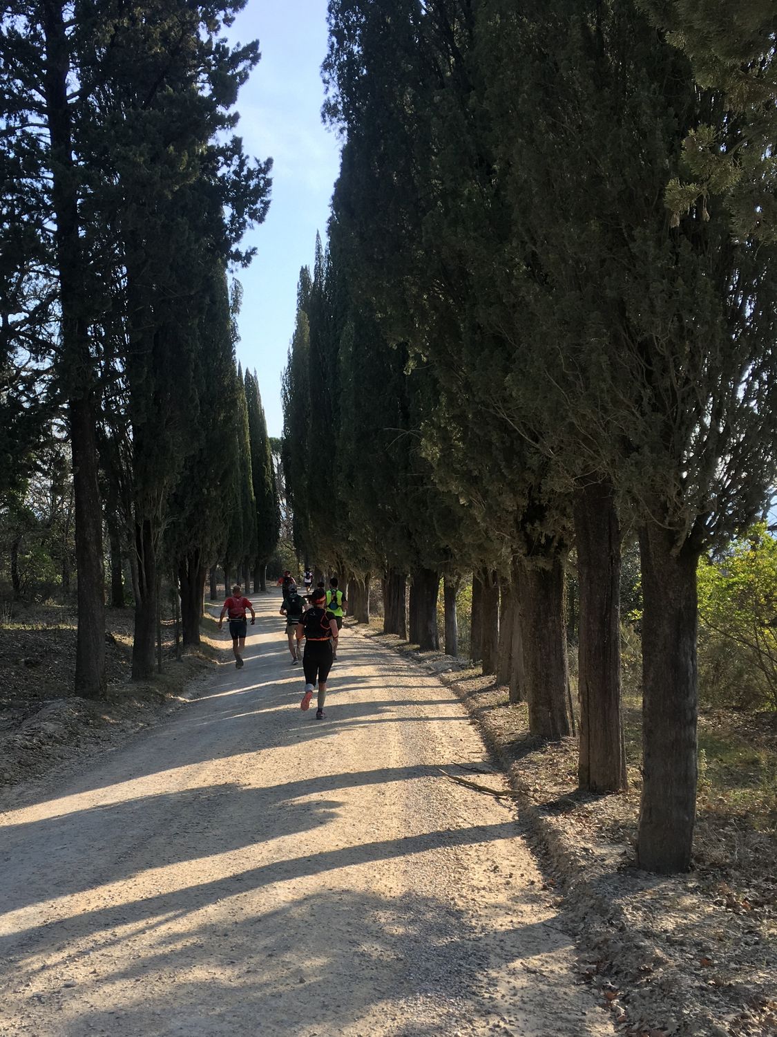 Die Strecke verläuft viel auf geschotterten Wegen durch Weinberge und Olivenhaine, aber auch richtige Singletrails durch Wälder und Weiden sind zu bewältigen. Man bewegt sich immer zwischen ca. 300 und 530 m üNN, also fast wie auf dem Schurwald, aber es geht dauernd auf und ab. Die Aussichten sind jedoch ganz typisch Toskana: Wein, Oliven, Zypressen-Alleen, herrschaftliche Anwesen und kleine Dörfer auf den Anhöhen. Unterwegs immer wieder Einheimische, die einen mit anfeuernden Rufen unterstützten. Leider war es in der Region in den letzten Wochen sehr trocken, weshalb die Landschaft manchmal eher grau als grün erschien. Dafür gab es an den insgesamt nur 3 Verpflegungspunkten eigentlich alles, was das Läuferherz unterwegs begehrt, außer den bei uns gewohnten isotonischen Getränken. Stattdessen "Caffè", wir sind schließlich in Italien. Wein wurde dagegen nicht angeboten.
