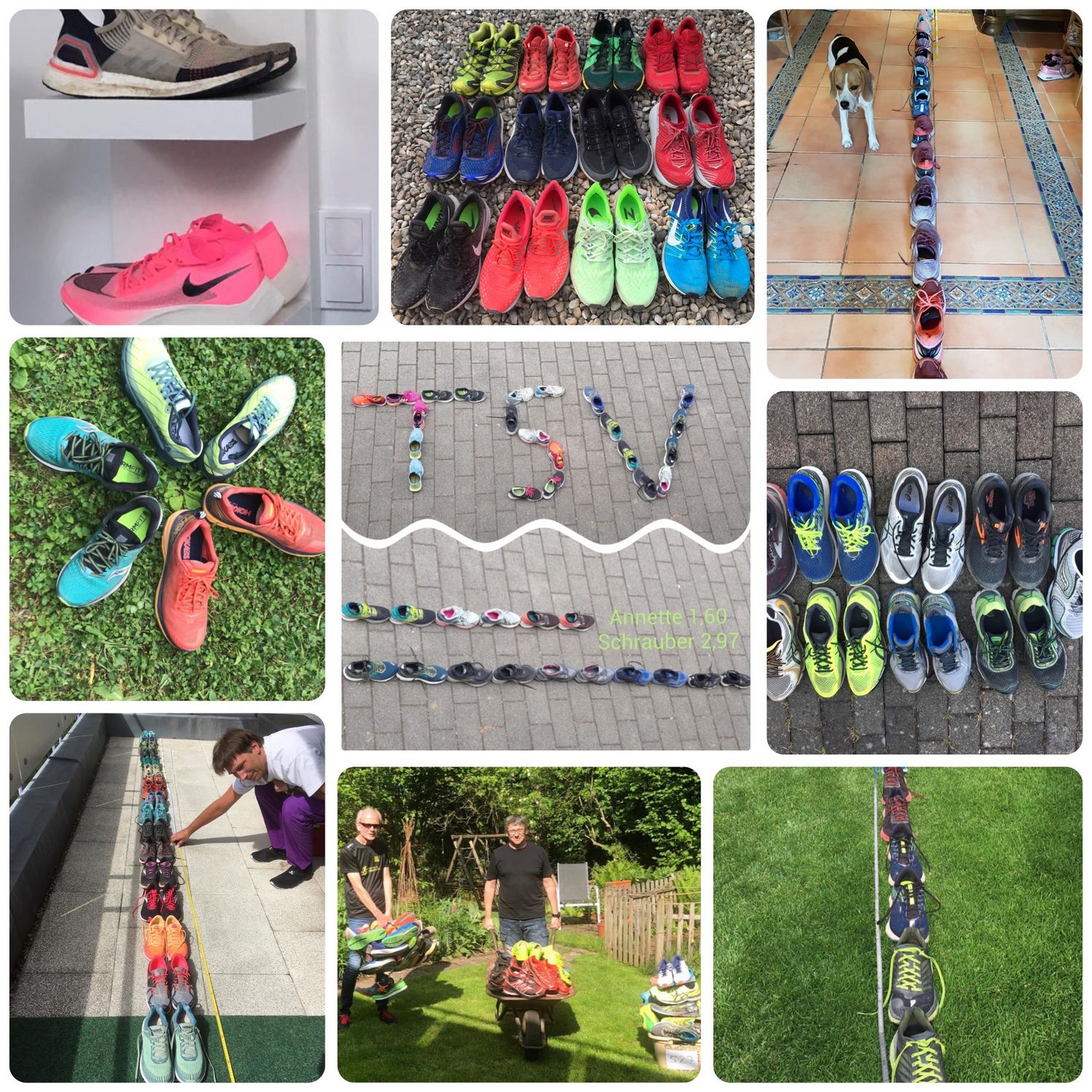 Wieviel Paare an Laufschuhen haben wir den so insgesamt in den Schränken aller Lauftreffler zusammen liegen und wie lang ist die Distanz, wenn wir alle Schuhe in einer Reihe auslegen würden?