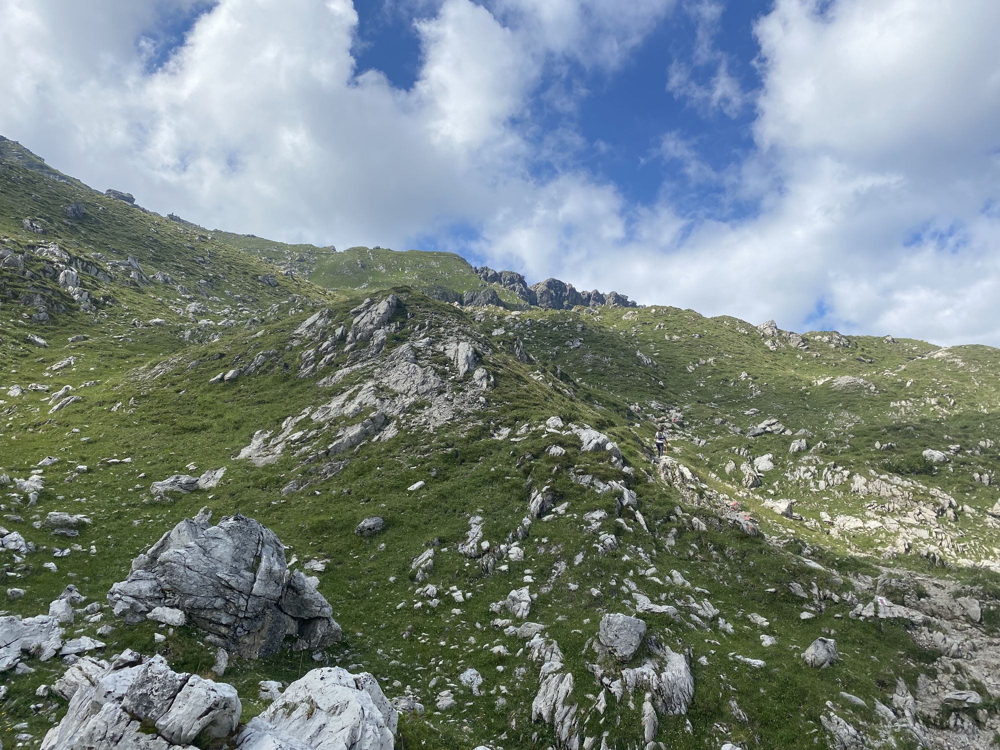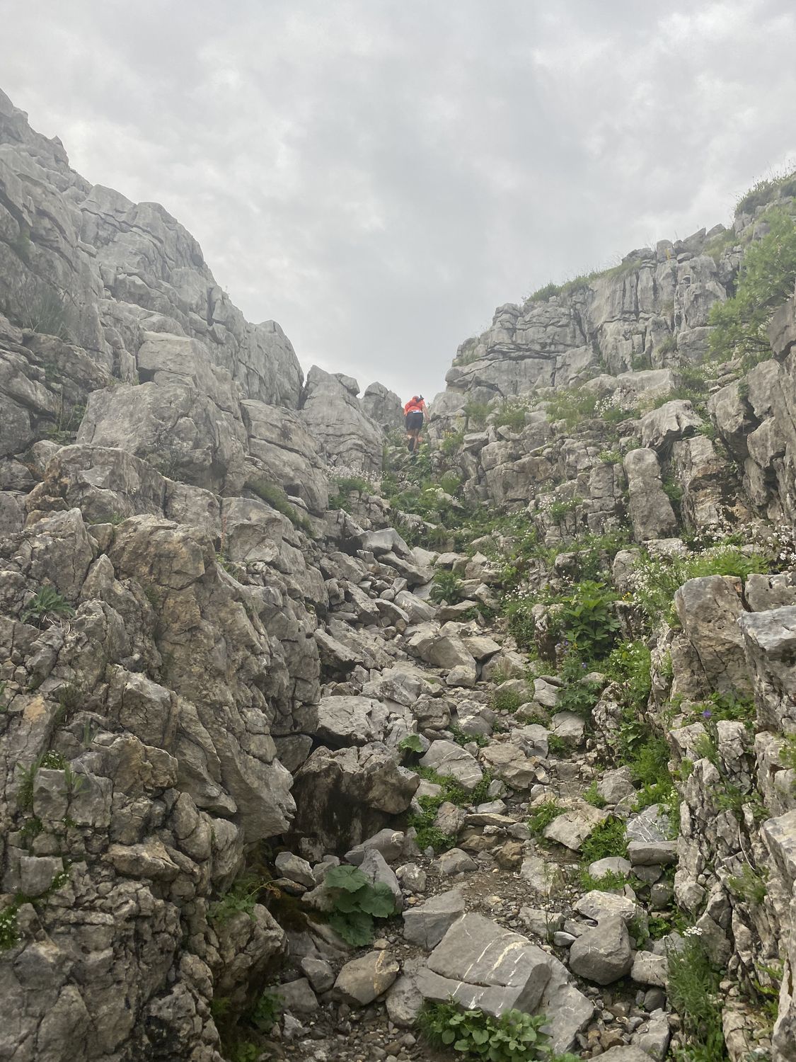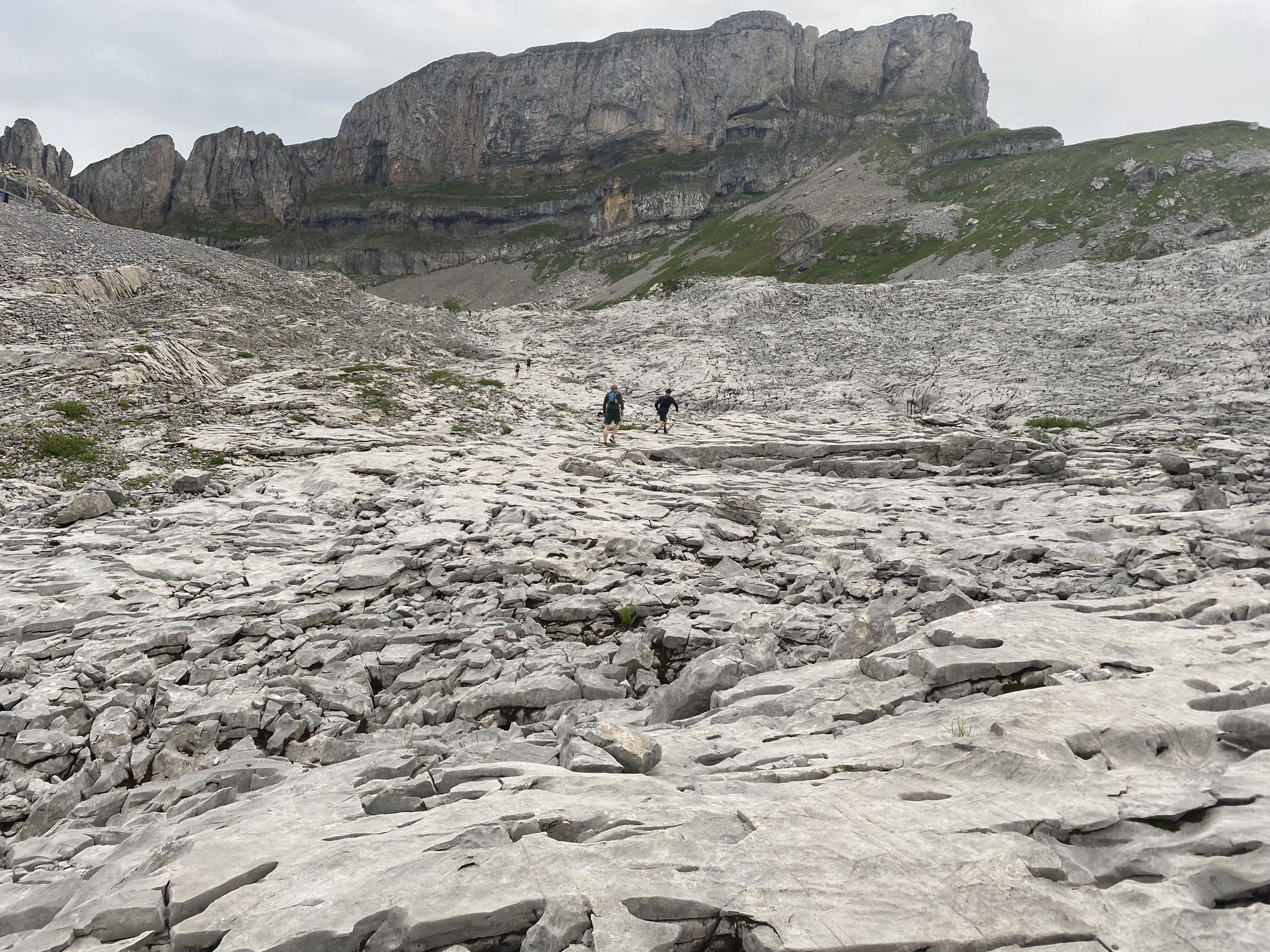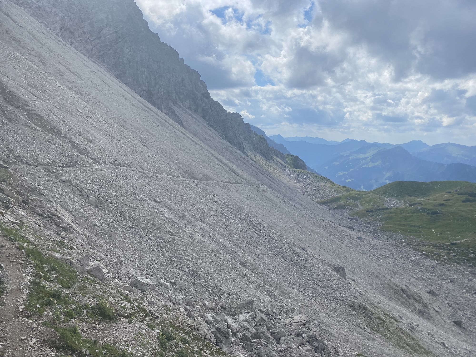 Und gleich ging es wieder direkte und humorlose 1.000 Höhenmeter am Stück bergauf in Richtung Widderstein. Es folgten leicht wellige, technisch anspruchsvolle Abschnitte an der Mindelheimer Hütte vorbei bis zum Fiderepass. Wer kennt das Ding? Brutal! Zur körperlichen Anstrengung kommt spätestens an diesem Punkt auch die mentale Herausforderung. Wenn man irgendwann mal oben an der Scharte angekommen ist, geht’s erstmal über ein langes loses Geröllfeld hinab zur Fiderepass Hütte. Dort ist der letzte Verpflegungspunkt aufgebaut und Kalle schloss auf Andrea und Chrissi auf.