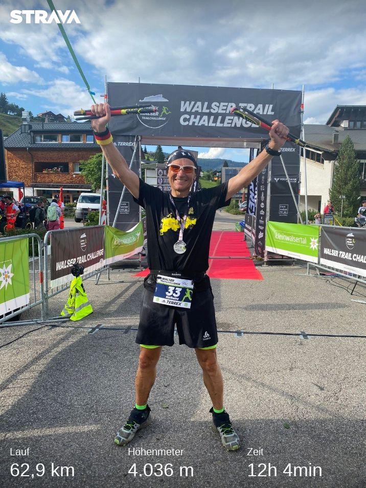 Kalle lief nach ziemlich genau 12 Stunden im Ziel ein. In der Gesamtwertung der Walser Challenge Pro belegte er damit mit einer Gesamtzeit von 13:57 Std. den 15. Platz und war dabei der Älteste unter allen Finishern.