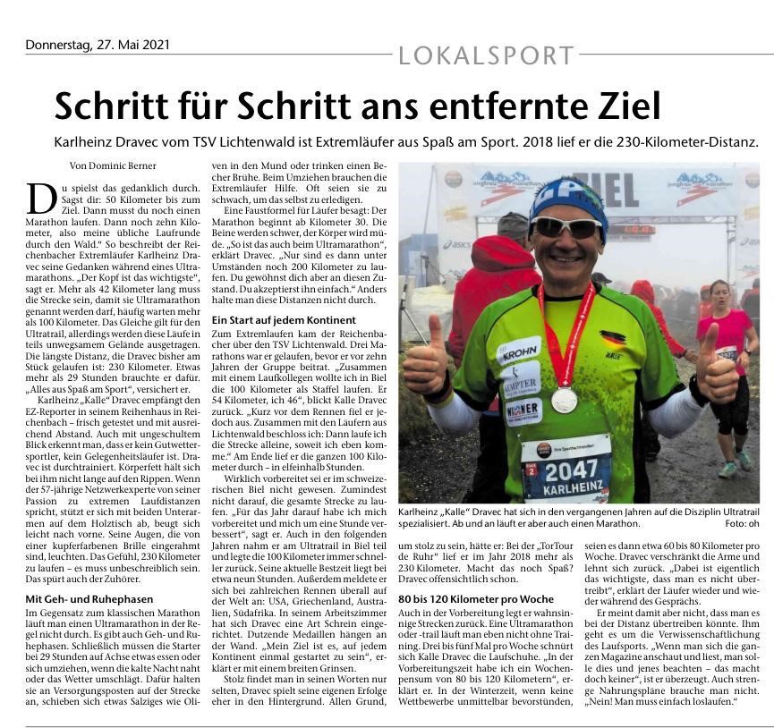 Ein Bericht über unseren Ultraläufer Kalle in der Esslinger Zeitung vom 27.05.2021