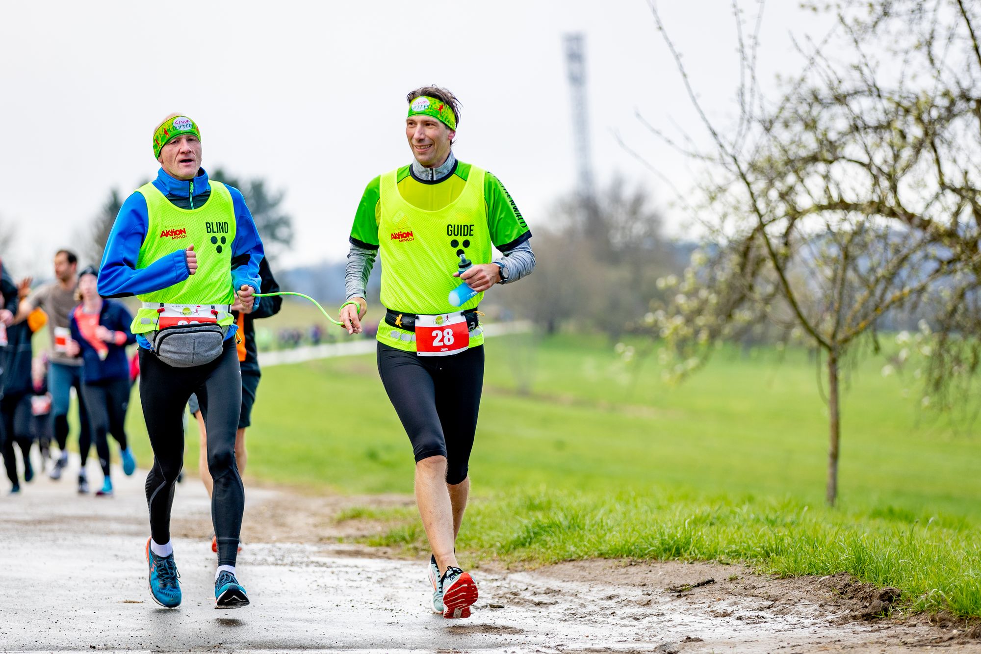 Gleich zwei unserer neuen Lauftandems wagten es sich erstmals an einem offiziellen Wettkampf unter das Teilnehmerfeld zu mischen. Bei den Lauftandems werden sehbehinderte Läufer von einem Guide begleitet und mittels einem Band und sprachlicher Hinweise gelenkt. Dass die beiden LIWA-Tandems schon ausgezeichnet miteinander harmonieren, spiegelte sich auch in absolut respektablen Laufzeiten wieder. Das Tandem Uwe Schwartz & Jens Jaeger benötigte nur 55:25 Min. und das zweite Tandem mit Pierre Heim & Daniel Guggenmos lediglich 62:10 Min. für die 10km. Absolut beeindruckend!