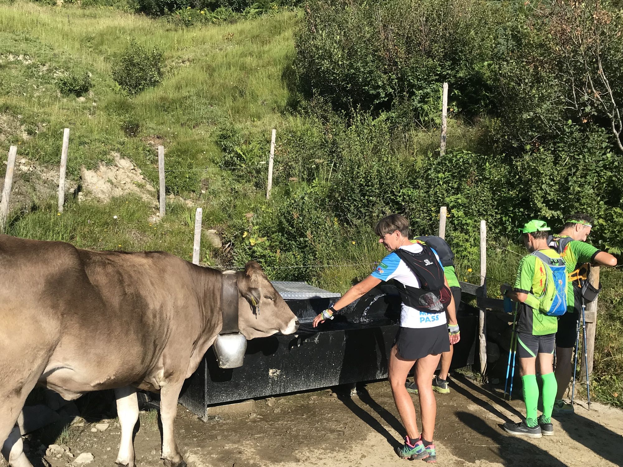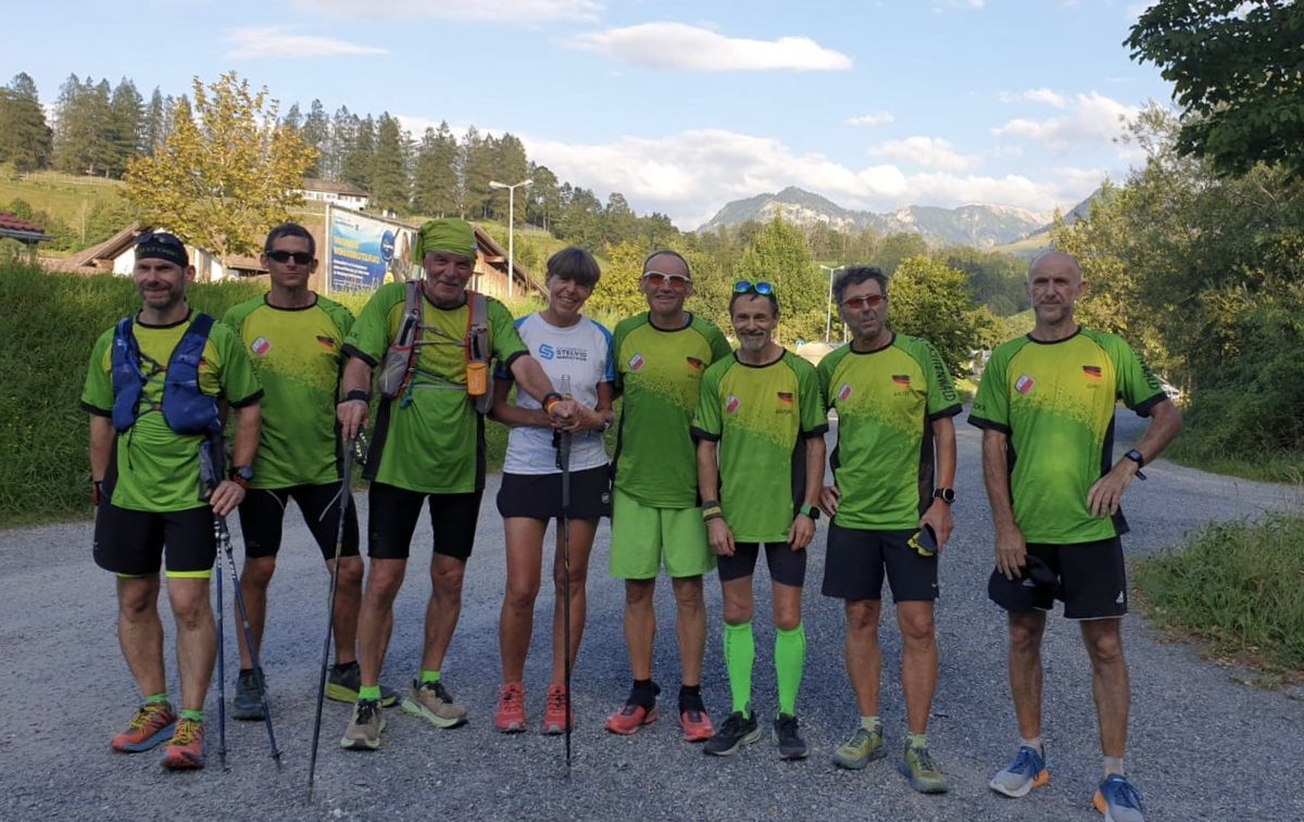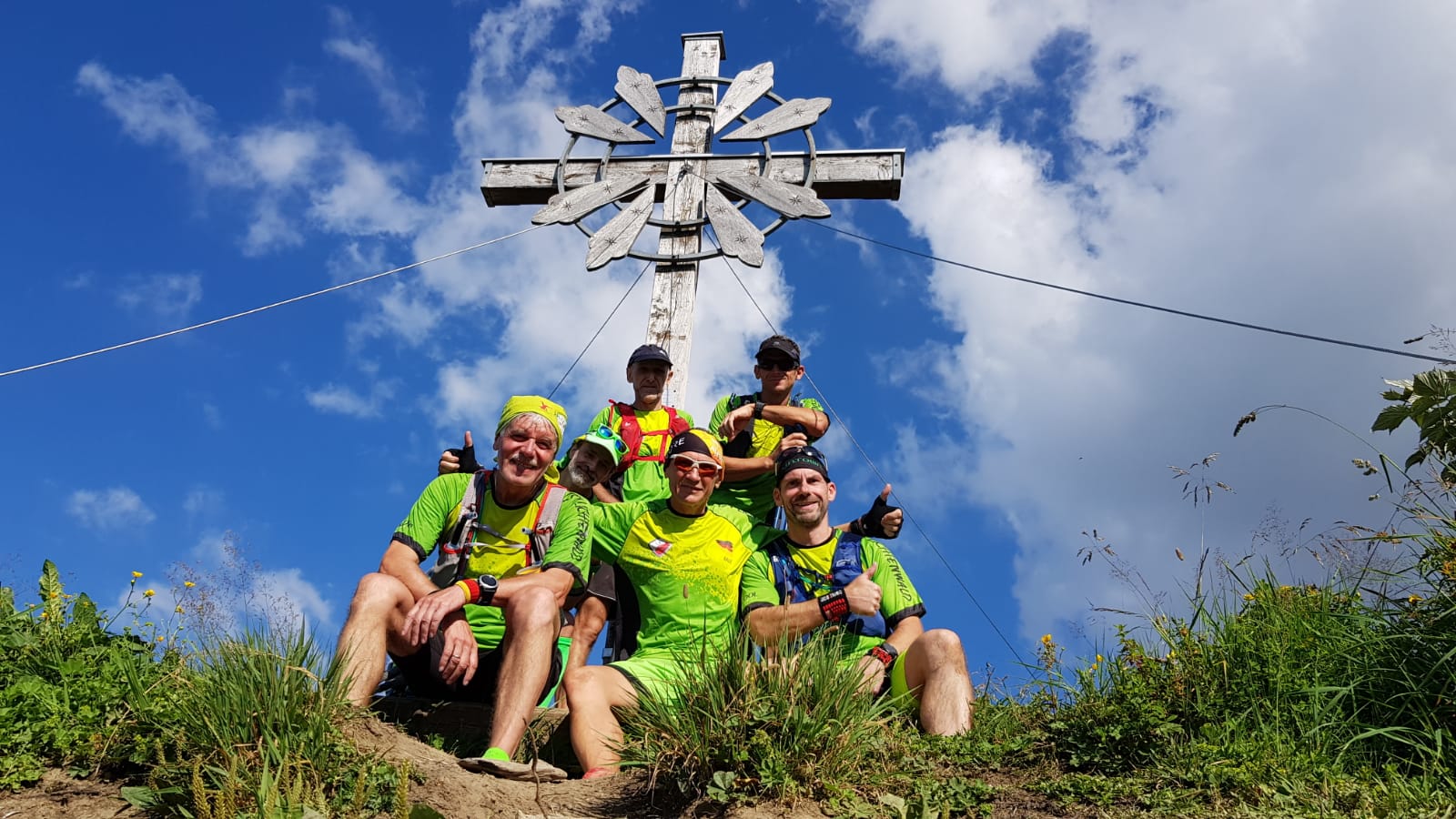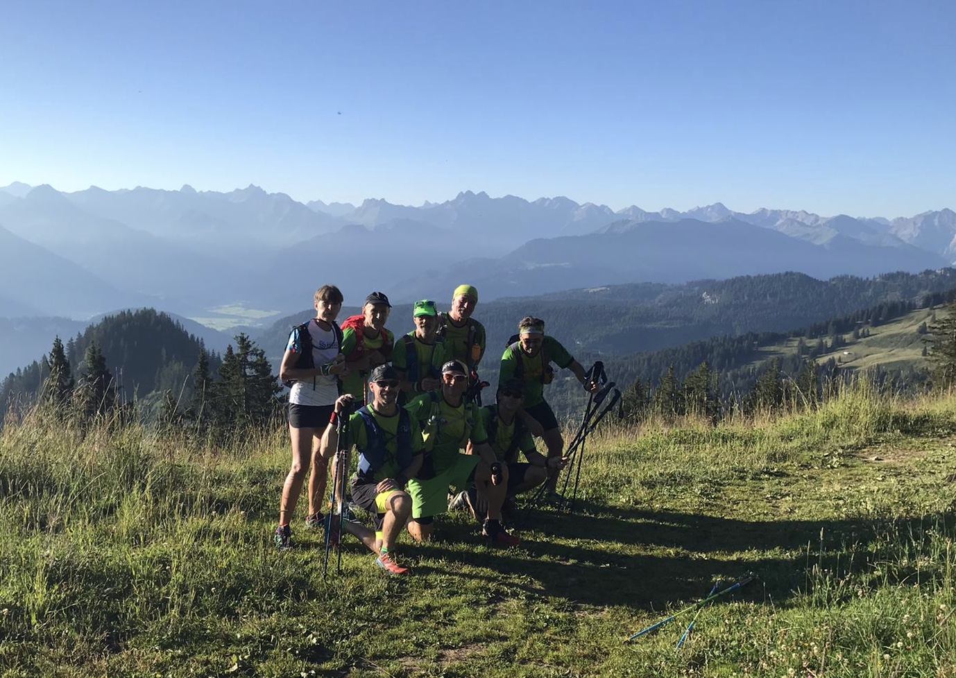 Mit dem Wissen, dass es einer der heißesten Tage des Jahres werden wird, starteten die sieben Jungs Armin, Gunther, Kalle, Klaus, Oli, Walter, Wolfgang um 5:30 Uhr am Freizeitbad Wonnemar in Sonthofen auf die 70 Kilometer lange und mit 3.000 Höhenmetern gespickten Ultra-Trail durch das Kleinwalsertal. Kurzfristig der Laufgruppe angeschlossen hatte sich noch eine bekannte Läuferin aus dem oberen Filstal, die dieselben Pläne verfolgte, sodass man zu Acht unterwegs war. Die Hälfte der Teilnehmer war bisher noch nie eine solch lange Distanz und auch nicht die Anzahl an Höhenmetern an einem Stück gelaufen. Auch die Trailrunning Erfahrung war nur bedingt vorhanden. Daher wurde von Beginn an die Option vereinbart jederzeit auch aussteigen zu können. Die Strecke führt von Sonthofen aus über die Hörnergruppe bis Riezlern ins Kleinwalsertal. Von dort zurück vorbei an der Bergstation der Söllereckbahn, hinüber zum Freibergsee, weiter bis nach Oberstdorf, an der Skisprung-Arena vorbei und zum Schluss noch mal hoch über den Sonnenkopf zurück nach Sonthofen. Die Läufer erwartet dabei ein ständiges auf und ab mit atemberaubenden Panoramen der Bergewelt. Die Sonne erwachte schnell an diesem Tag und heizte der Laufgruppe wie erwartet schon zu einem frühen Zeitpunkt ganz gut ein. Auf den welligen Abschnitten und in den anspruchsvollen Single-Trails war höchste Konzentration gefordert. Da es ja keine organisierten Verpflegungspunkte gab, musste man die Nahrungs- und Flüssigkeitsbedarfe soweit es ging mit sich führen. Natürlich nutze man unterwegs jede noch so kleine Quelle an Bergwasser um sich zu erfrischen. Am einen oder anderen Trog musste man sich eben auch mal hinter Weidekühen anstellen, bis man ans Wasser ran kam. Nachdem man nach gut 6 Stunden in Riezlern die Hälfte der Runde geschafft hatte, nutze man erstmals auch eine Alpe um sich kurz zu erholen, mal etwas länger im Schatten zu verweilen und auch andere Getränke als Wasser zu sich zu nehmen.