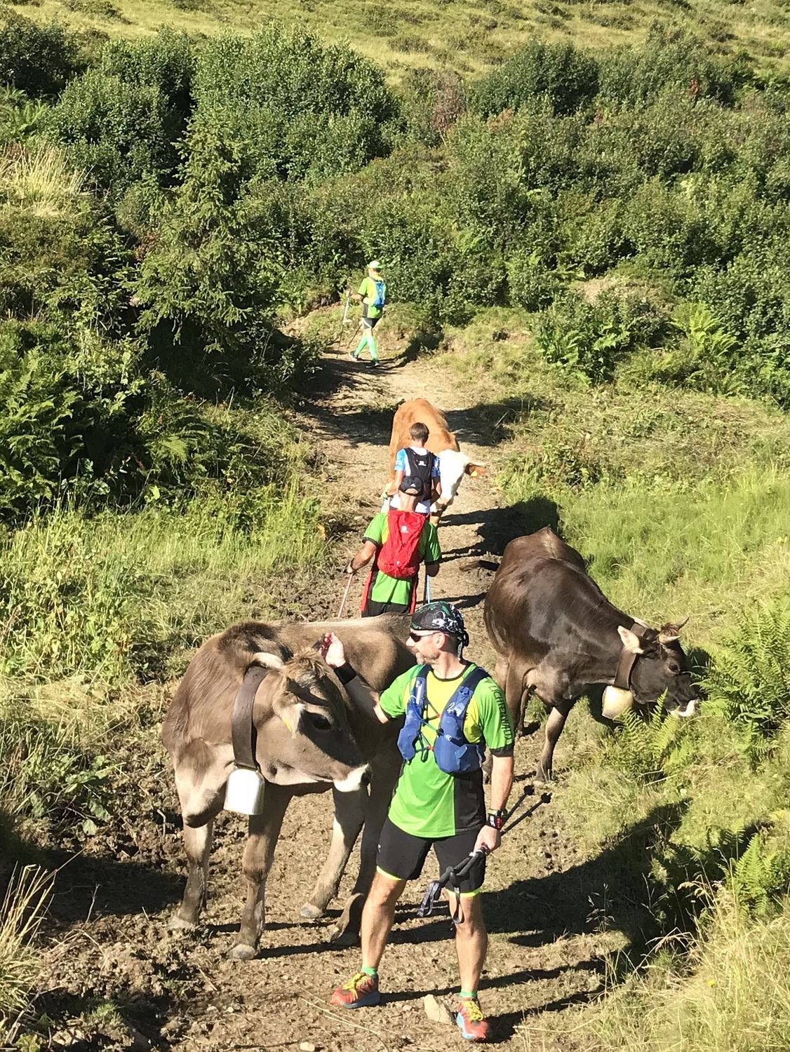 Die letzten 10 km ging es teilweise nochmal halsbrecherisch bergab. Jetzt hatte der eine oder andere dann doch auch mit Krämpfen und harten Oberschenkeln zu kämpfen. Entsprechend vorsichtig und langsam ließ man es dann nach unten rollen. Nach insgesamt 13:15 Stunden lief man dann wieder in Sonthofen auf dem Parkplatz des Wonnemars ein und wurde von Angelika, Walter, den Partnerinnen und anderen Begleitern fröhlich empfangen. Glückwunsch und Respekt im Besonderen an Klaus und Wolfgang, für die es ein neuer persönlicher Rekordlauf in Sache Distanz, Höhenmeter und Laufzeit war.