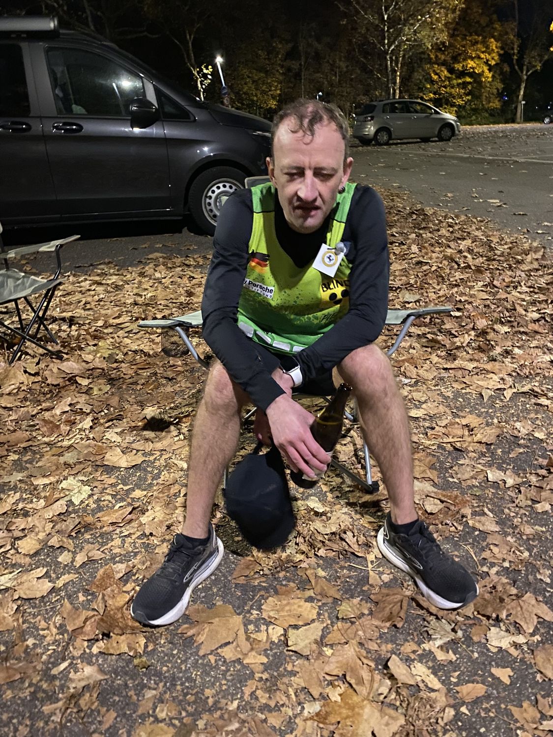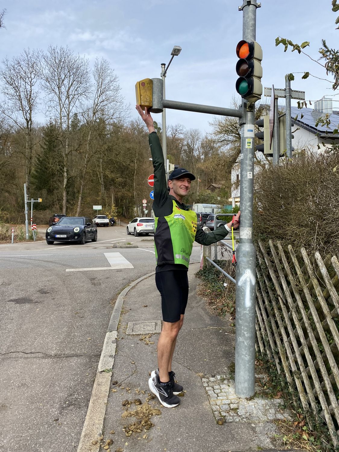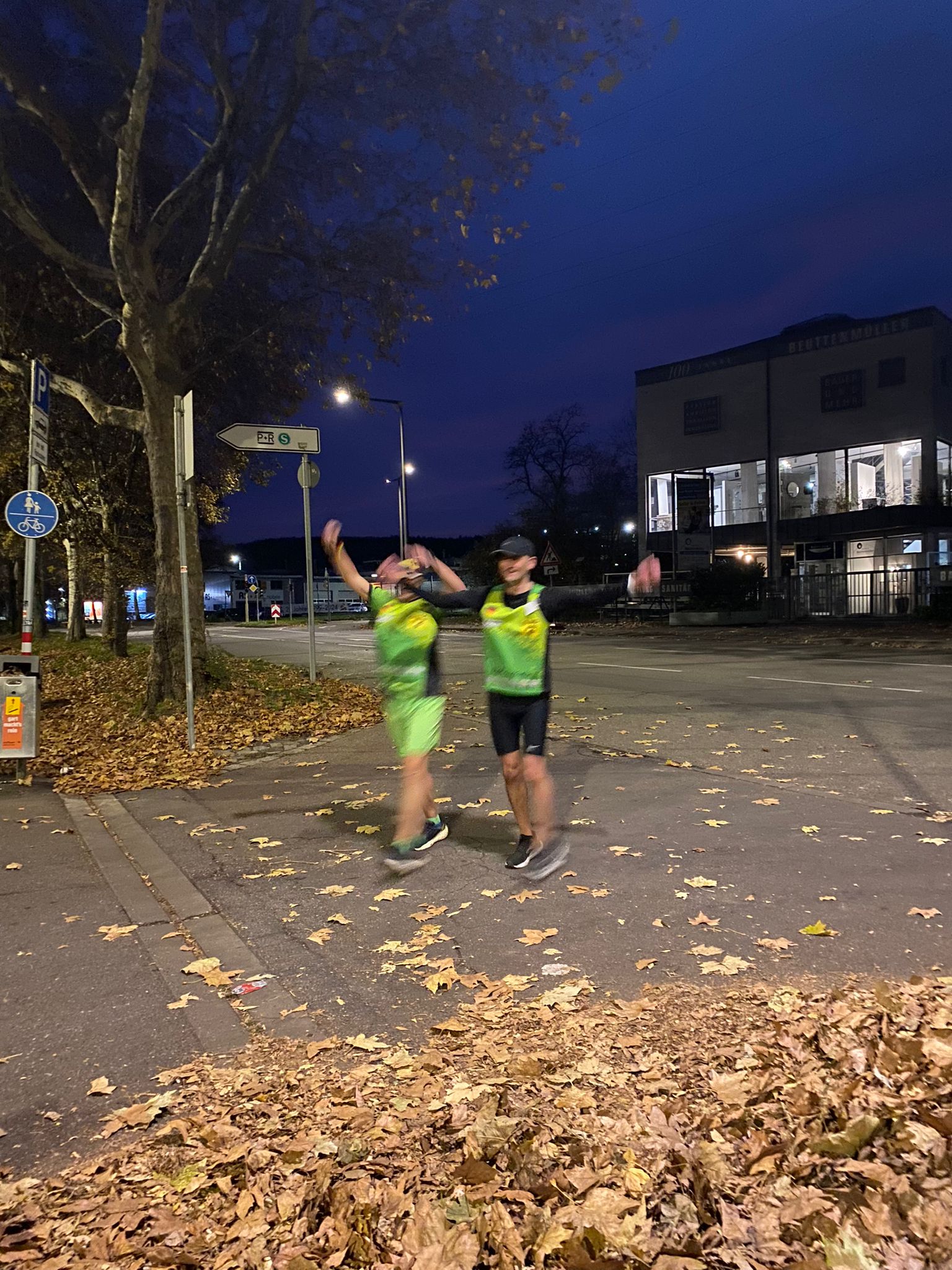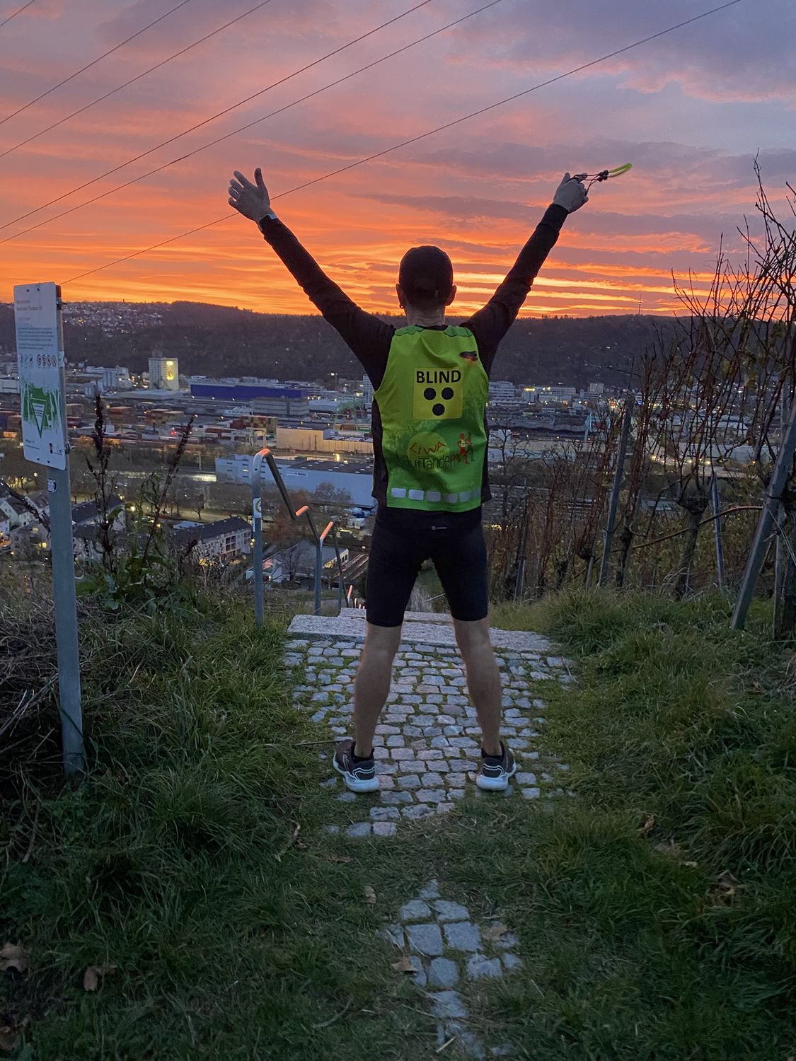 Danach ging es dann fast schon kitschig in den Sonnenuntergang hinein, zurück durch die Weinberge nach Obertürkheim. Die endlosen Treppenabgänge im Weinberg erforderten von beiden nochmal maximale Konzentration. Dann war es geschafft. Nach langen 9 Stunden und 20 Minuten erreichten die beiden wieder den Ausgangspunkt am Bahnhof in Obertürkheim und wurden dort von ihrem Team mit viel Beifall empfangen.