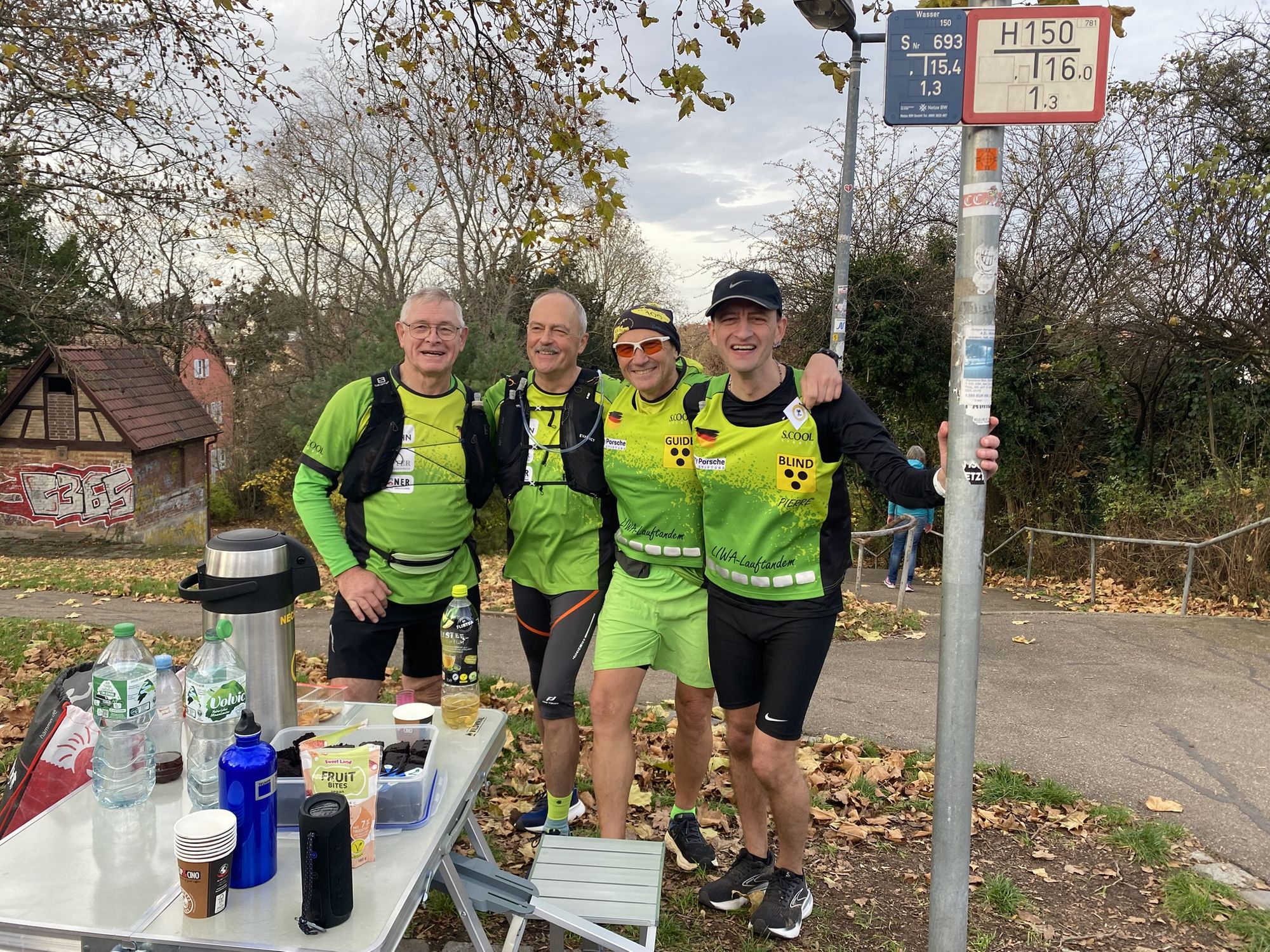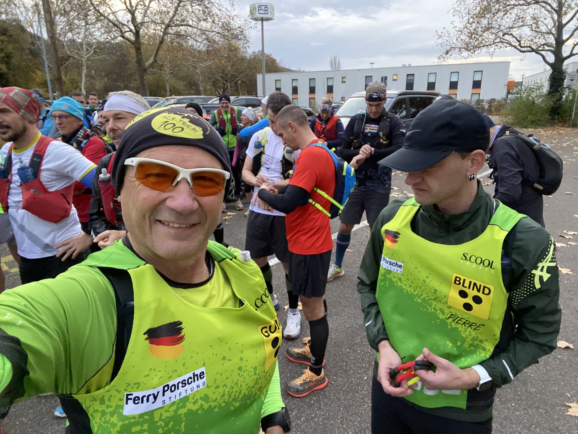 In diesem Jahr erstmals mit am Start war auch einer von unseren blinden Läufern. Pierre wollte im Tandem mit Kalle seinen ersten Ultra-Marathon laufen. Für Pierre gleich in doppelter Hinsicht eine neue Dimension. Er ist zwar erst vor ein paar Wochen Deutscher Meister im Para-Marathon geworden, doch nie war er weiter als die klassische Distanz von 42,2 Kilometern gelaufen und auch mehr als 700 Höhenmeter hatte er am Stück noch nie bewältigt. Die Herausforderung dabei war nicht nur die Distanz, sondern auch das unbekannte Terrain. Die blinden Athleten bevorzugen möglichst barrierefreie Wege, auf dem Rössleweg jedoch gibt es ständig wechselnde Untergründe. Asphalt, Pflastersteine, Treppen, Feldwege, Wald- und Wiesenböden und Singletrails wechseln sich ständig ab. Da ist alles dabei, was einen blinden Menschen schon beim normalen Spazierengehen herausfordert. Und das Ganze jetzt auch noch im Rennmodus und über mehrere Stunden hinweg. Und es sollte dann auch tatsächlich ein extremer Tag werden.