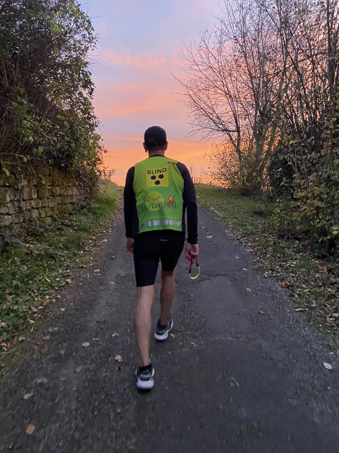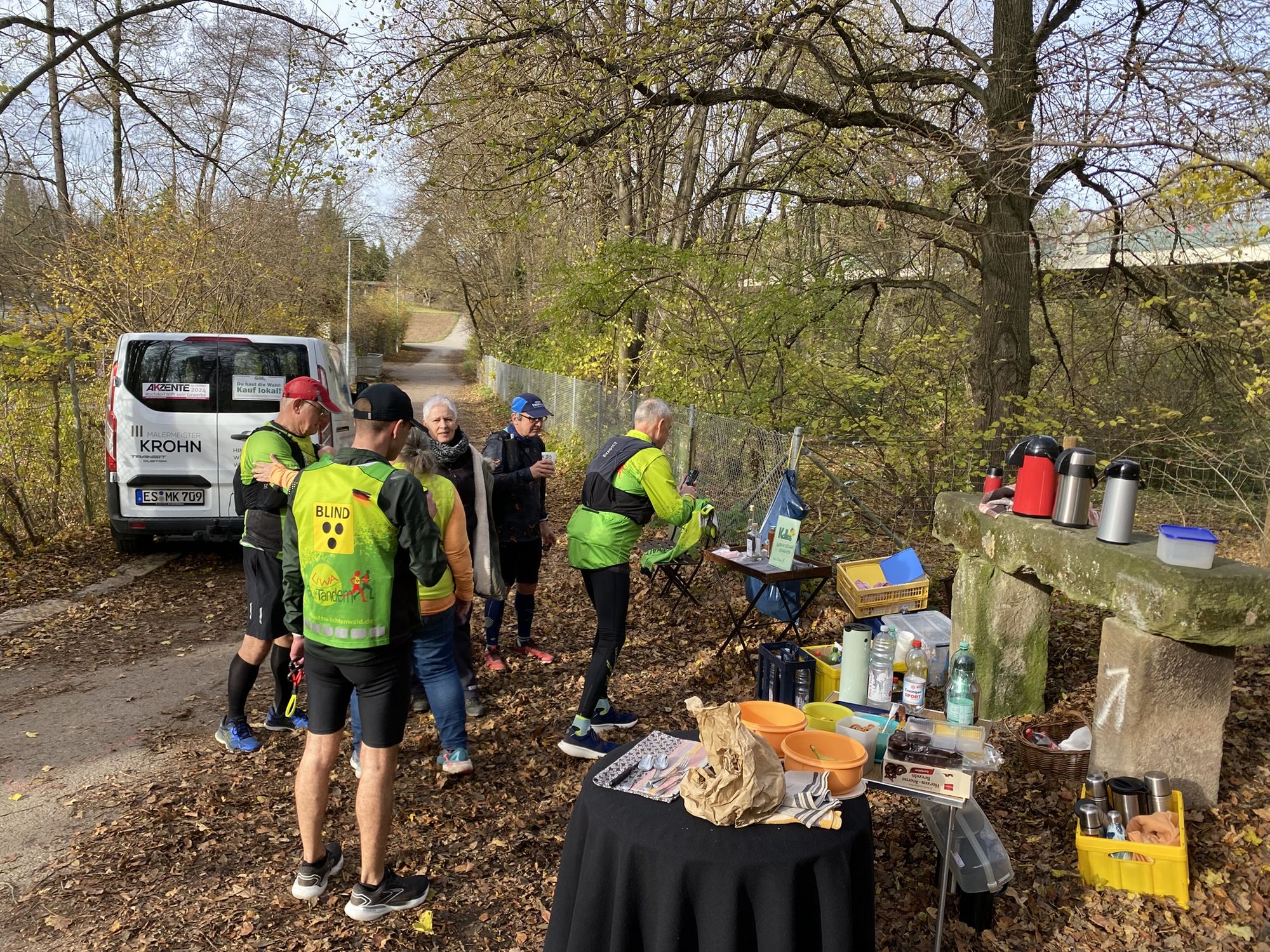 Das trockene und nicht allzu kalte Wetter an diesem Tag sorgte schon vor dem Start für eine gute Stimmung. Anfangs überwiegend trockene Beläge sorgen für eine gewisse Sicherheit. Als dann die ersten Abschnitte mit viel Laub bedeckten Waldwege und Trails folgten, war vom Guide höchste Konzentration gefordert, um dem Schützling möglichst stolper- und sturzfrei durch diese Passagen zu leiten. Auch wenn man schon ein eingespieltes Team ist und der Blinde den Hinweisen seines Guides maximal vertraut, schaltet dann doch der Kopf unterschwellig einen zusätzlichen Schutzmechanismus ein. Ganz besonders in einer Gegend in der man zuvor noch nie gelaufen ist und mit dem Wissen, dass es noch ewig so weitergehen wird. Die Aufgabe für den Guide ist groß.