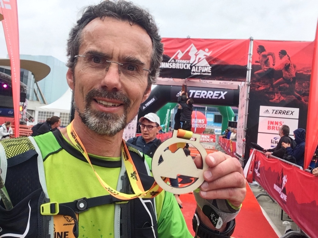 Der Lauf startet etwas außerhalb von Innsbruck in Kranebitten. Zum Aufwärmen geht es die ersten 3 km ganz flach am Inn entlang. Dann kommt der lange Anstieg zur Mutterer Alm, die bei km 17 erreicht wird. Da hat man dann auch schon fast den höchsten Punkt der Strecke erklommen. Auf dem Höhenweg geht es dann lange abwärts bis nach Telfes bei km 25, alles auf wunderbaren Singletrails. Laut Streckenprofil könnte man dann eigentlich ins Ziel rollen, aber es gibt doch noch viele kurze, knackige Anstiege mit ca. 100 Höhenmetern, welch die Konditionsreserven fordern. Insgesamt waren über 1.600 Höhenmeter zu überwinden. Beim letzten Abstieg vorbei an der Bergisel Schanze ist das alles vergessen, das Stadion ist zum Greifen nah. Nach 5:58:23 Stunden überquerte Bernd die Ziellinie.