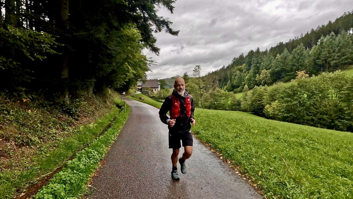 Am zweiten Tag wartete ein abwechslungsreicher Rundkurs zwischen Elztal und Kinzigtal – flowige Singletrails, knackige Rampen und schnelle Waldwege. Das Wetter zeigte sich von seiner ungemütlichen Seite: kühl, nass und windig. Und die Blessuren vom Vortag machten sich bei jedem Schritt bemerkbar. Trotzdem ging Jürgen wieder an den Start. Er lief klug, dosierte seine Kräfte und ließ sich nicht aus der Ruhe bringen. Und pünktlich, zwei Tage vor seinem 44. Geburtstag, kam er nach 4 Stunden und 44 Minuten ins Ziel – ein perfektes Geschenk an sich selbst und der erfolgreiche Abschluss der Masters-Wertung.