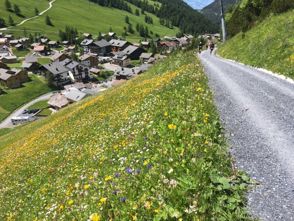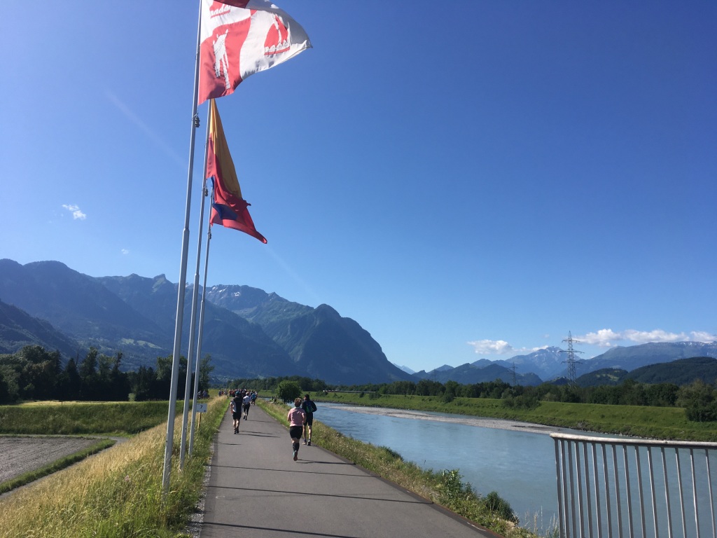 Vom start im kleinen Ort Bendern läuft man zunächst entlang des Rheins bis in die Hauptstadt Vaduz, alles total flach. Dort geht es durch das Stadtzentrum hoch zum Schloss aus dem 12. Jahrhundert, dem Wahrzeichen des Fürstentums, und ab in die Berge. Bis km 21 hat man schon über 1.200 Höhenmeter in den Beinen. Immer wieder bieten sich herrlich Blicke ins Rheintal. Dann hat man die Hochebene erreicht, die nächsten 11 km von Silum über Steg nach Valorsch sind reines Genusslaufen: herrliche Wege, Bergpanoramen, Alphornbläser, blühende Almwiesen und Kühe mit Glockengebimmel.