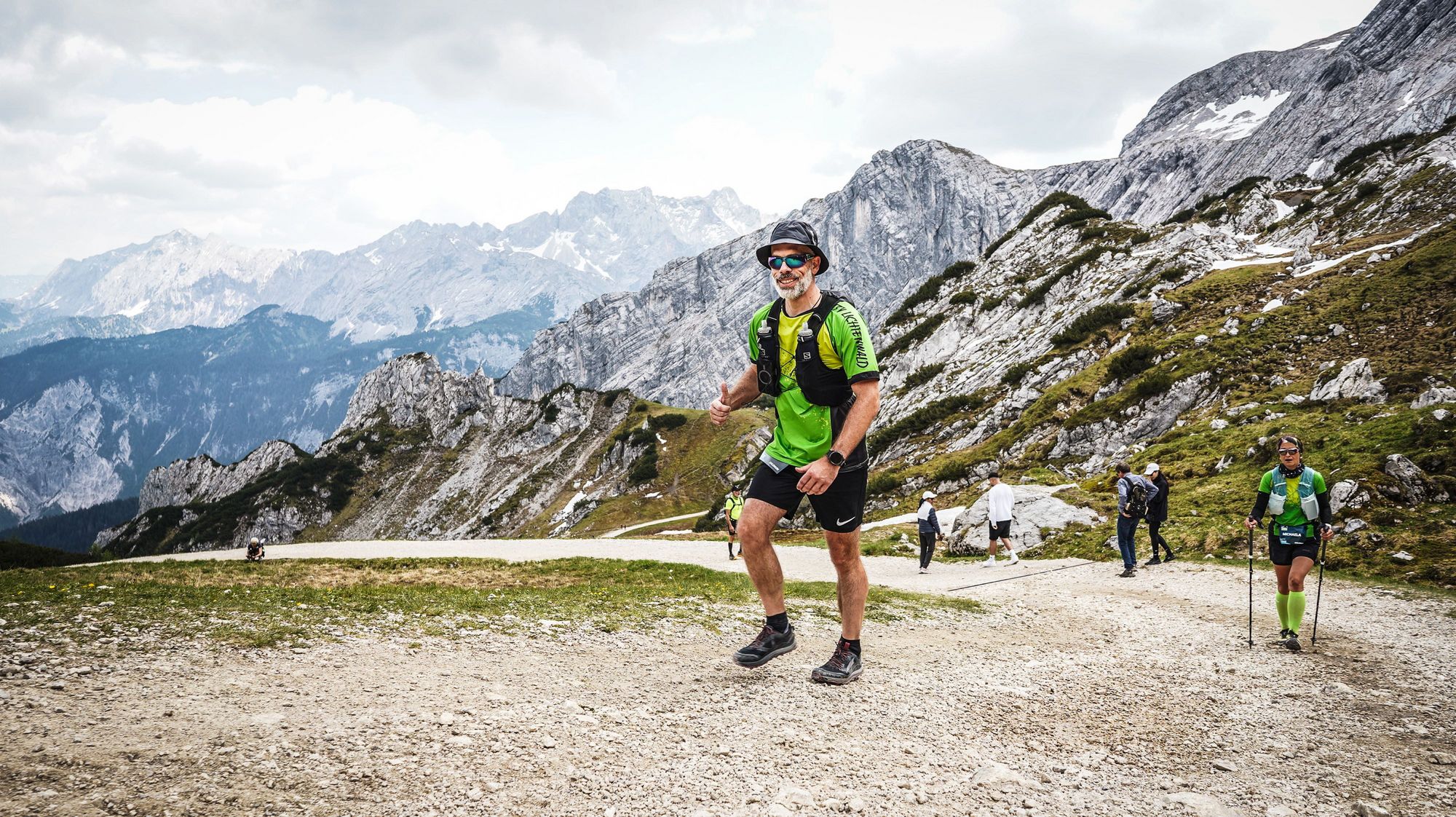 Am Verpflegungsposten Laubhütte angelangt, konnte man seine dringend benötigten Energiespeicher wieder auffüllen, denn ab hier erfolgte ein langer und für viele doch sehr mühsamer Aufstieg zum Kreuzeckzubringer. Dort angelangt, wurde man mit tosendem Applaus, Klatschen, Kuhglocken und Musik empfangen. Die grandiose Stimmung konnte man schon von 3 km Entfernung wahrnehmen und sorgte für einen Extraschub Motivation. Inzwischen befand man sich im alpinen Terrain und um einem herum ragten riesige und beeindruckende Felsgiganten in die Höhe. Über den VP Hochalm ging es weiter zum höchsten Punkt der Strecke auf 2.025 m ü. M., dem Osterfelderkopf. Die Strapazen hatten sich gelohnt, denn bei idealen Wetterbedingungen konnte man hier ein sensationelles Panorama genießen, mit Blicken zur Alpspitze, dem Höllental und natürlich runter nach Garmisch-Partenkirchen. Michaela wurde am Peak sogar von ihrem Mann empfangen, der extra hier oben einen Klettersteig bewältigte und das muntere ZUT-Treiben von noch weiter oben verfolgen konnte.
