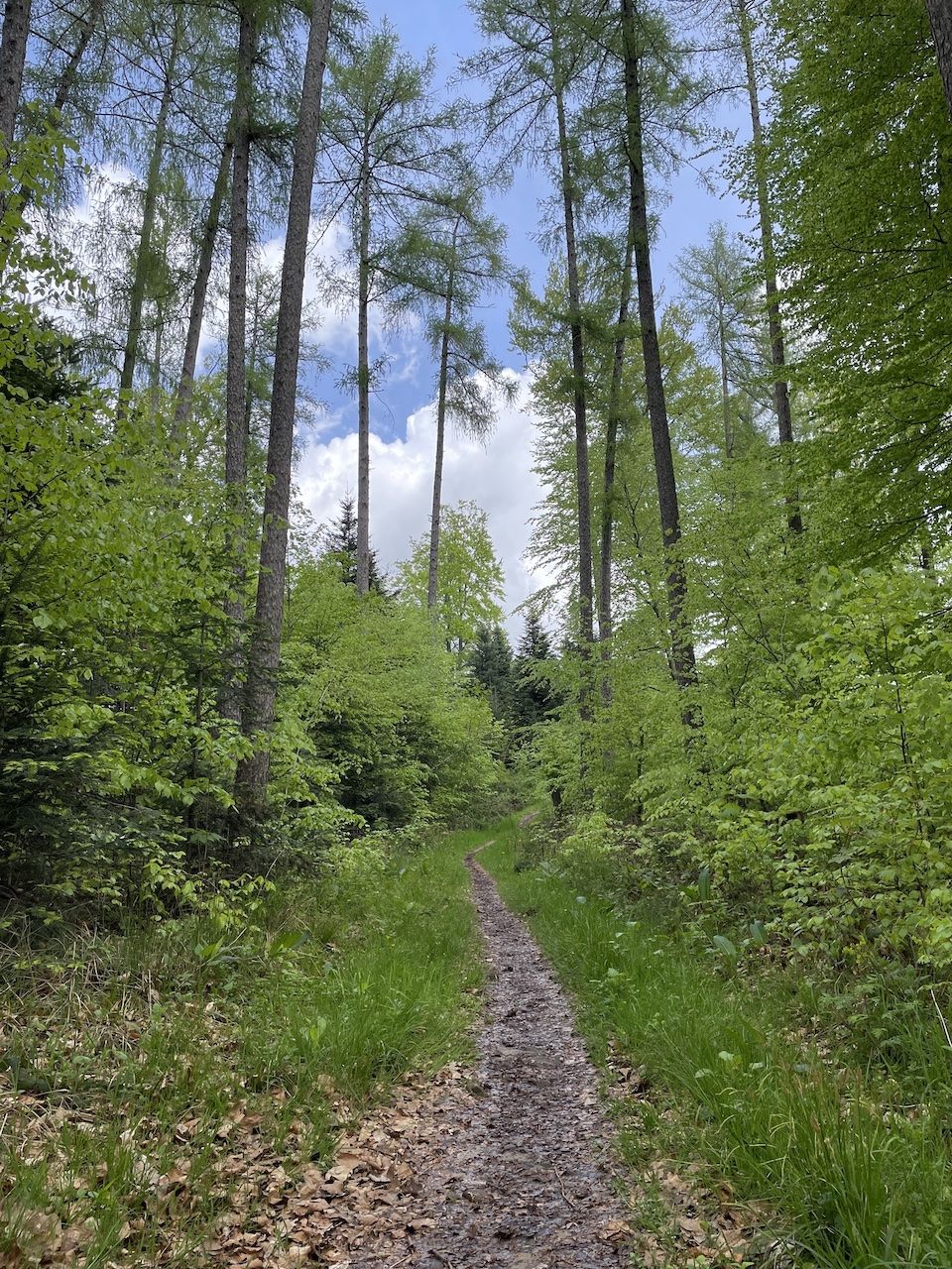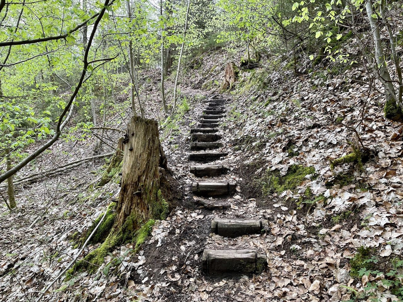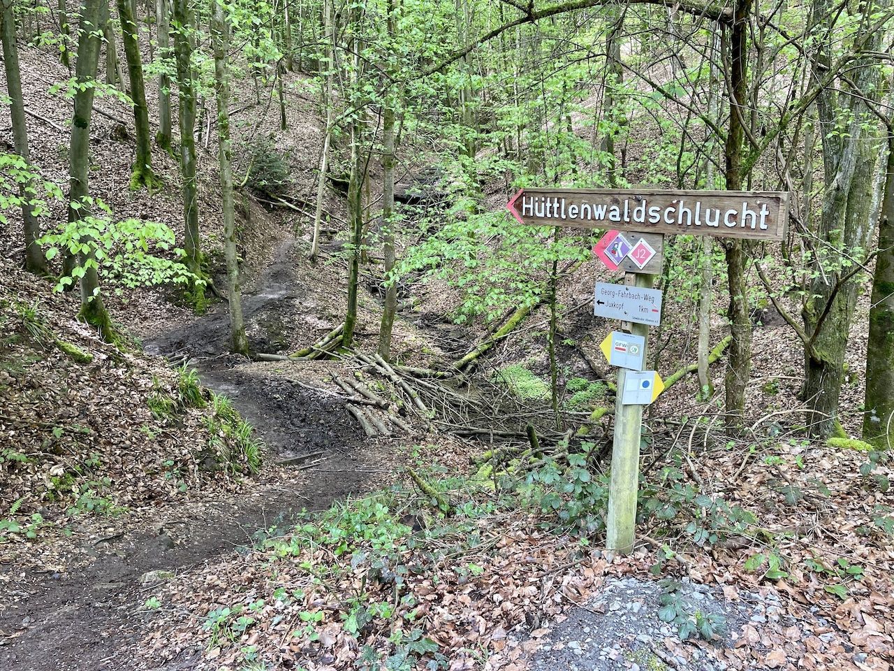 Nun folgten zahlreiche und kilometerlange Single-Trails, die uns beinahe durch den Schwäbischen Wald fliegen ließen - zumindest bergabwärts. Wo es runter ging, ging es später auch wieder hoch. Das recht anspruchsvolle Streckenprofil bot teilweise schweißtreibenden Passagen mit Steigungen von bis zu 40%. Auch viele Forstwege die sich – bedingt durch Wald- und Baumfällarbeiten – recht unwegsam präsentierten galt es zu durchkämmen. Die sehr abwechslungsreiche Strecke ließ zu keiner Zeit Langeweile aufkommen und bescherte immer wieder wunderschöne Momente, wie z. B. bei der Umrundung des Bleichsee oder dem Aufstieg zum Juxkopf (533 m. ü. M.) mit seinem 1932 erbauten hölzernen Juxkopf-Turm und atemberaubendem Panoramablick. Ein weiteres Naturschauspiel erwartete uns in der "Hüttlenwaldschlucht". Die tief eingeschnittene Klinge gefiel durch ihre steilen Hänge, Felswänden aus Stubensandstein, Halbhöhlen und kleinen Wasserfällen. Hier war es ebenfalls etwas schmierig und eine Wegstelle sogar seilgesichert.