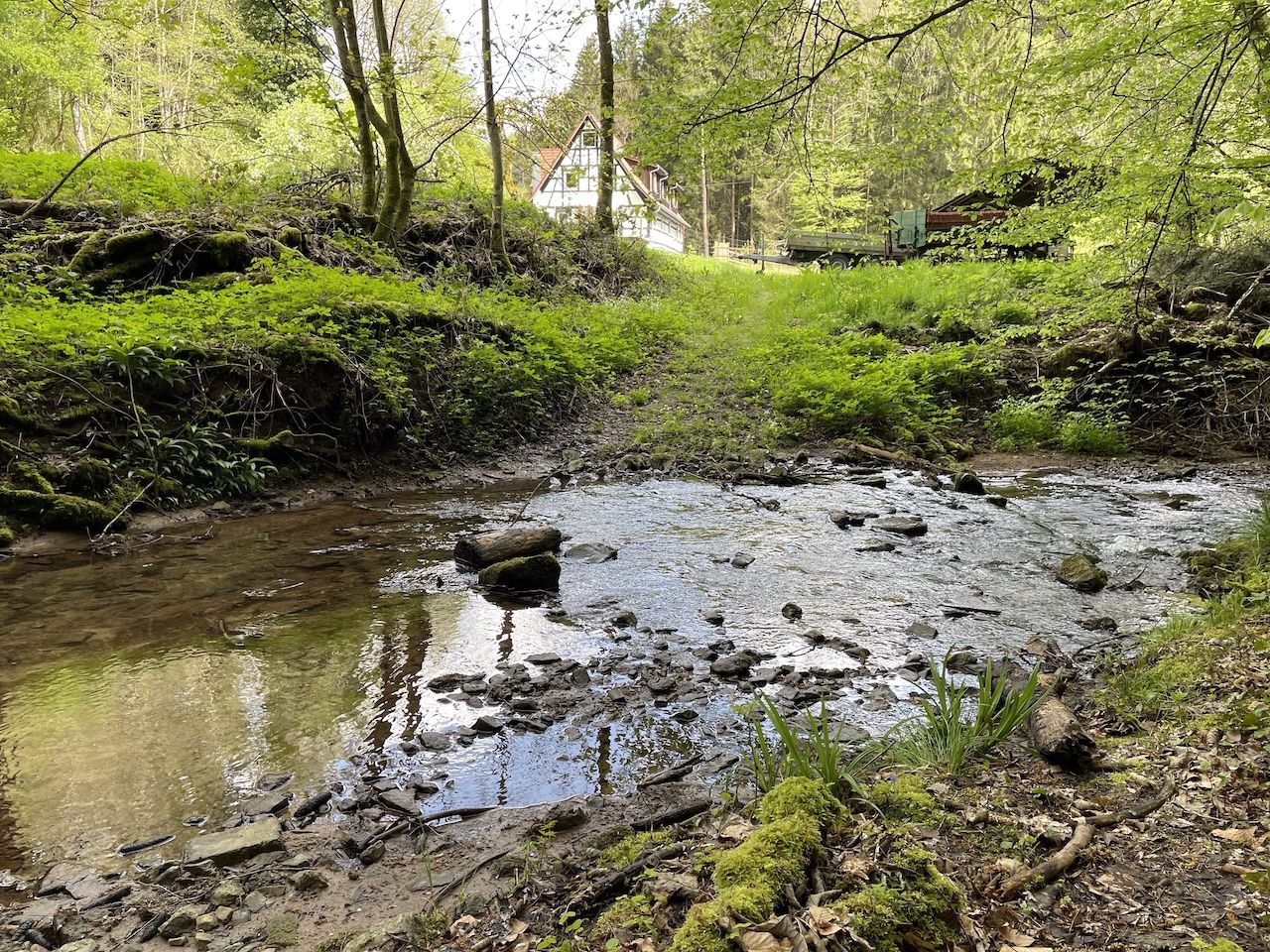 Nachdem sich alle Teilnehmer vor dem Gasthof "Zum Goldenen Ritter" eingefunden hatten, erhielten wir von Veranstalter Gernot Wurst noch eine kurze Einweisung und Hinweise zur heutigen Strecke. Punkt 9 Uhr fiel dann auch schon das Startkommando. Die Führung des Rundkurses wurde so ausgerichtet, dass möglichst viele Single-Trails und Natursehenswürdigkeiten des Schwäbischen Waldes anzutreffen waren und so dauerte es auch nicht lange, bis die ersten zwei Highlights vor den Füßen lagen. Beim Naturdenkmal "Tobelschlucht" durchquerten wir eine Bachklinge des Dentelbaches mit kleinem Wasserfall und einer grottenartig unterspülten Felsbank ("Hohler Stein"). Hier waren Trittsicherheit und Vorsicht gefordert, denn der Untergrund erwies sich teilweise ziemlich matschig und rutschig. Die fast im Anschluss folgende "Bodenbachschlucht" ist eine wilde und urwüchsige Felsschlucht. Der nadelbaumreiche Wald, mit vielen Moosen und Farnen, zeigte sich in diesem Streckenabschnitt von seiner besonders beeindruckenden und ursprünglichen Seite. Hier stieg man gelegentlich über Treppenstufen, mit geländergesicherten schmalen Pfaden und über kleine Brücken.