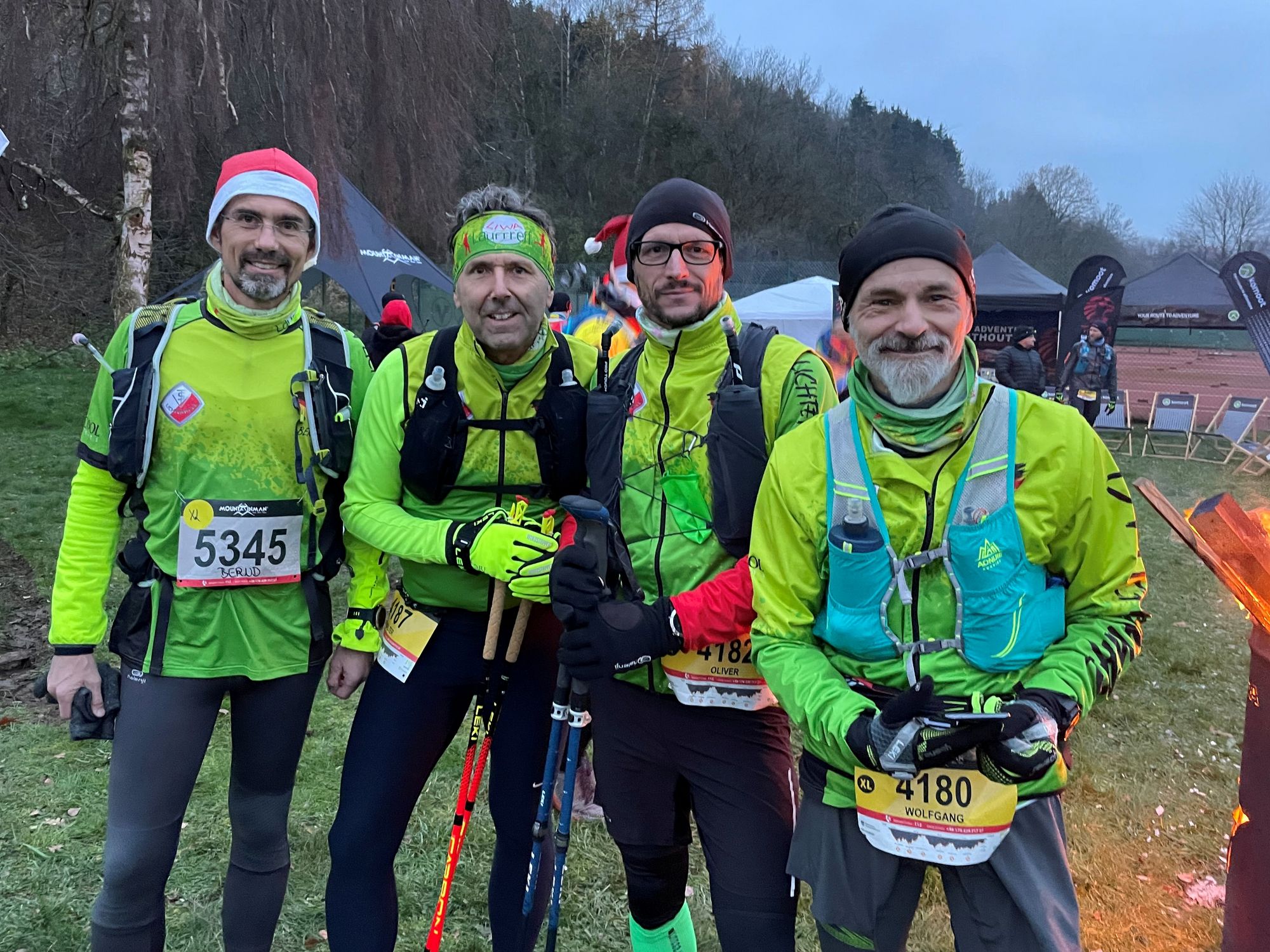 Keine halben Sachen, so könnte man den MOUNTAINMAN Nikolaus-Trail Pommelsbrunn auch überschreiben. In der Herbrucker Schweiz, ca. 40 km östlich von Nürnberg gelegen, hat der Veranstalter traumhaft schöne Strecken für ambitionierte Trailläufer ausgesucht. Distanzen vom 5 km Wichtel-Trail bis zum 42 km XL Nussknacker-Trail wurden angeboten. Vom Liwa Lauftreff haben sich gleich 4 Läufer für die XL-Variante mit der Marathondistanz und 1.300 Höhenmetern entschieden. Wolfgang Hohlbauch, Oliver Hees, Walter Krohn und Bernd Göhner wärmten sich vor dem Start noch an den Lagerfeuern, denn es war recht frostig morgens um 8 Uhr.
