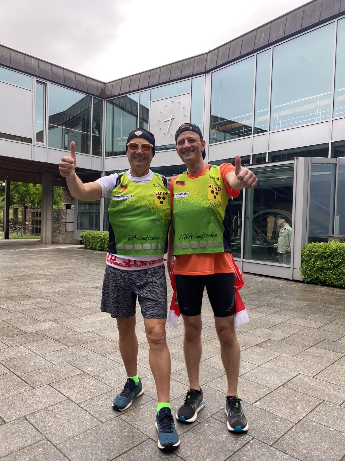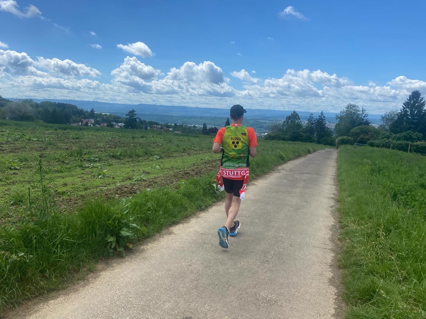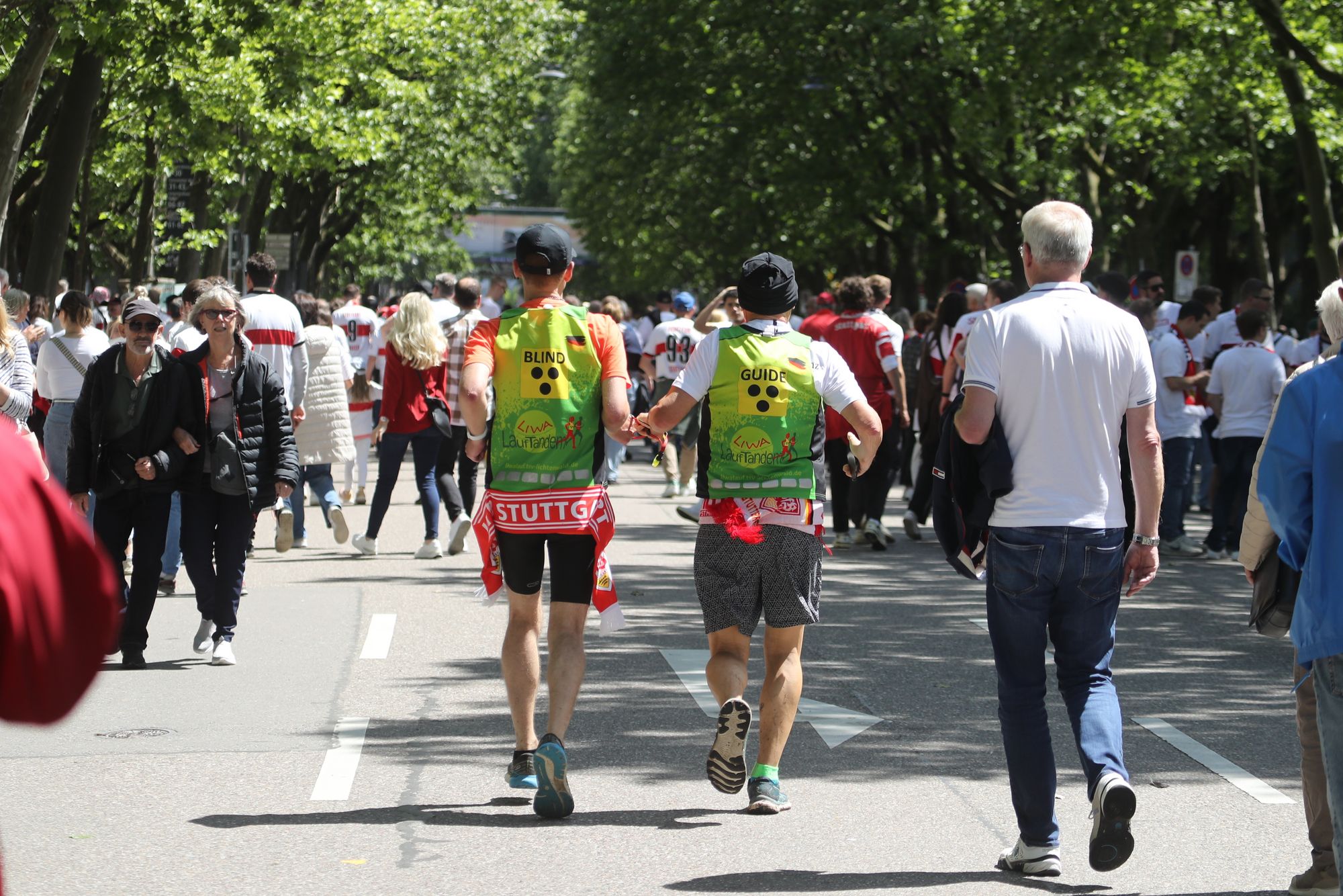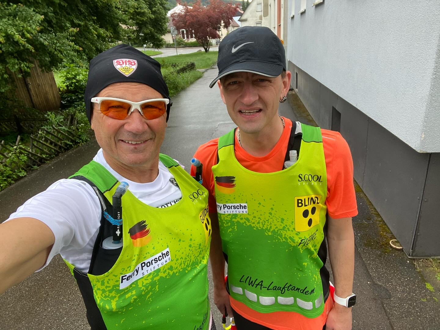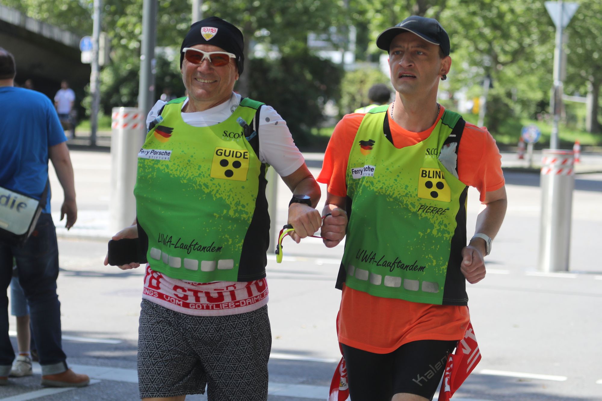 Einer unserer blinden Mitglieder ist Pierre aus Reichenbach. Er ist seit seiner Jugend blind und großer VfB-Fan. Seit vielen Jahren besitzt er eine Dauerkarte beim VfB und ist bei allen Heimspielen im Stadion dabei. Der VfB bietet den blinden Fans einen ganz besonderen Service. Sie bekommen das Spiel von einem eigenen Kommentator mit vielen Details beschrieben, was sie dann über Kopfhörer verfolgen können. Der Laufsport und der VfB sind Pierres größte Hobbys. Das wollte er nun am letzten Spieltag der Bundesliga miteinander verbinden und die Strecke von seiner Haustür aus bis in die MHP-Arena in Stuttgart läuferisch mit einem Marathon zurücklegen. Mit diesem Lauf wollte Pierre zeigen was man trotz einer körperlichen Einschränkung und dank der Inklusion alles erreichen kann. Begleitet wurde er dabei vom LIWA-Ultraläufer und ebenfalls großem VfB-Fan Kalle.