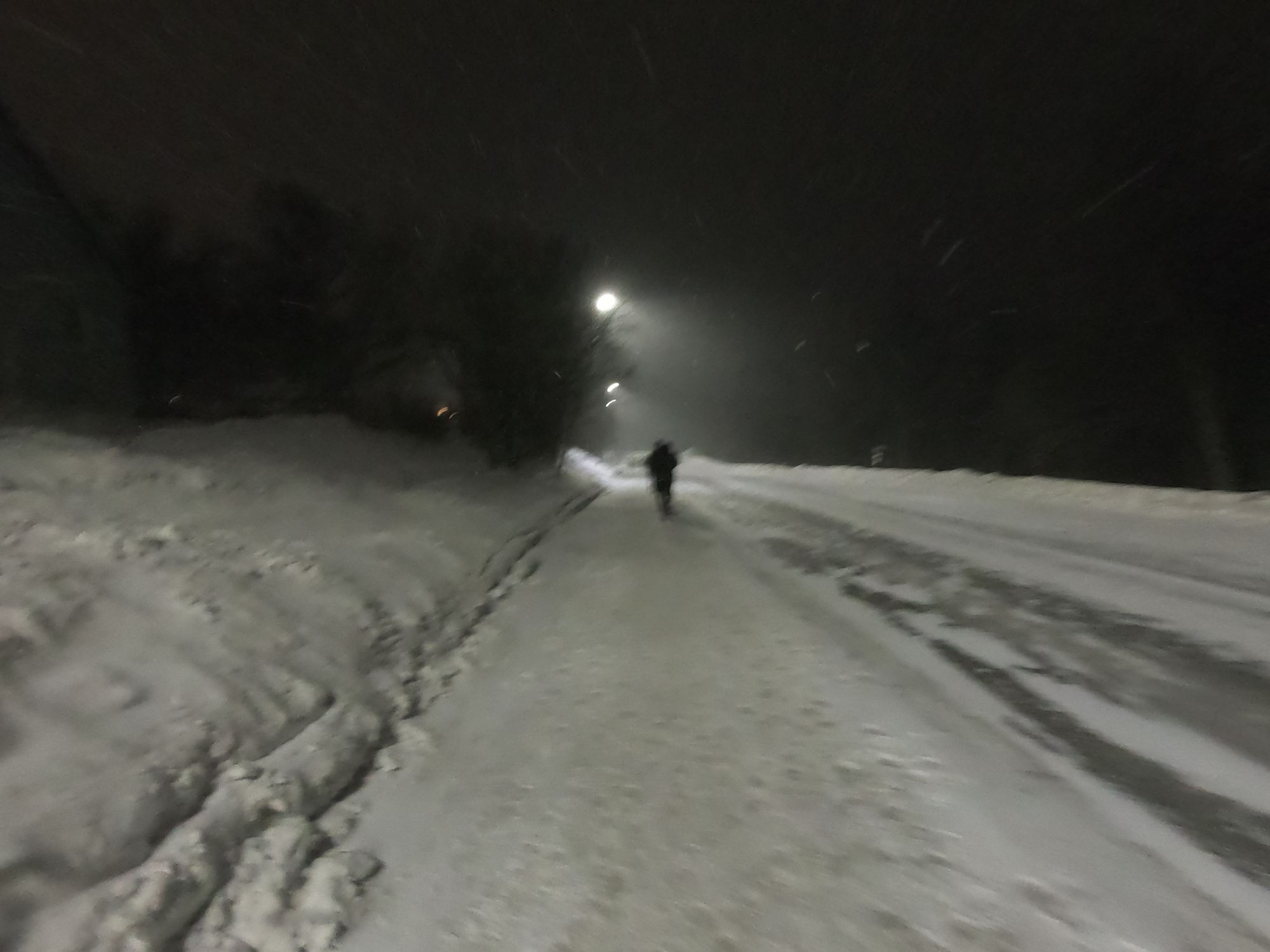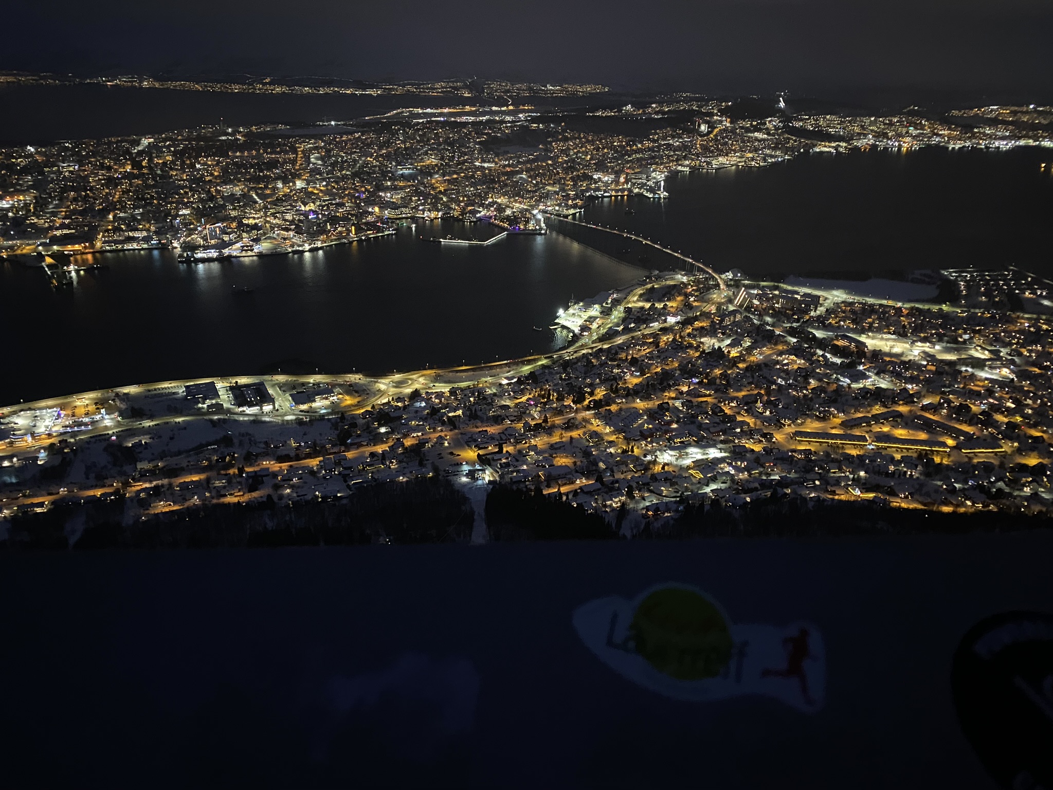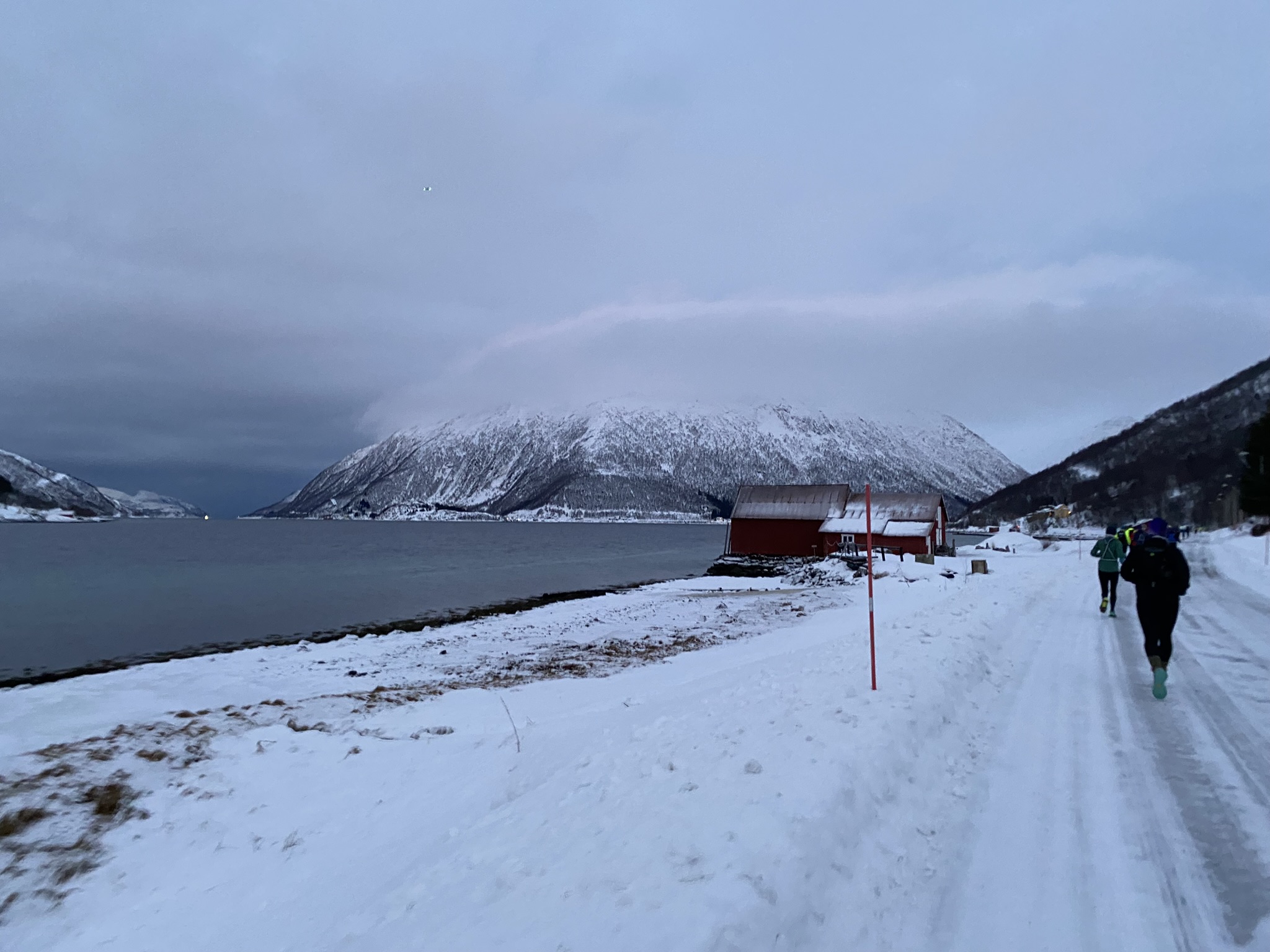 Schon eine halbe Stunde später lief man in die Dunkelheit hinein. Das Feld, des auf 100 Teilnehmer limitierten Wettkampfes, zog sich schnell auseinander. Man war die meiste Zeit allein für sich unterwegs. Nach ein paar Hügeln und Kurven und mit zunehmender Dunkelheit wurden die Bedingungen durch einsetzen Schneefall und Winden aus allen Richtungen immer rauer. Da nebenher die Landschaft zu fotografieren keinen Sinn mehr machte, konnte Kalle sich voll und ganz aufs irgendwie in Bewegung zu bleiben konzentrieren. Das Gesicht wurde mit einem Schall geschützt und ein zweites Paar Handschuhe über die dünneren halfen das zunehmende Frieren zu verzögern. Ziemlich genau nach der Hälfte der Strecke bog man wieder in die Zivilisation ein. Ab hier ging es über die Nebenortschaften auf einem gut beleuchteten Radweg entlang in Richtung Tromsø. Nach ca. 32 km ging es schließlich über die Sandnesssundbrua, welche mit einer Höhe von 41 Metern und einer Länge von 1,2 km die höchste Brücke in Tromsø ist. Kreuzfahrten erleben hier ihren Höhepunkt. Doch die cruisen schön gemütlich unten durch während die Läufer nach schon über 3 Stunden Kampf in den Beinen jetzt bei Blizzard artigen Windböen und starken Schneefällen oben drüber laufen mussten. Augen zu und drüber, denn durch den eiskalten Wind drohten die tränenden Augen trotz dem Schutz einer Brille zu gefrieren.