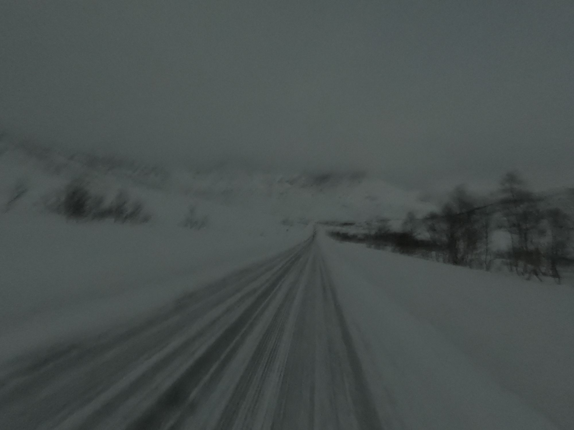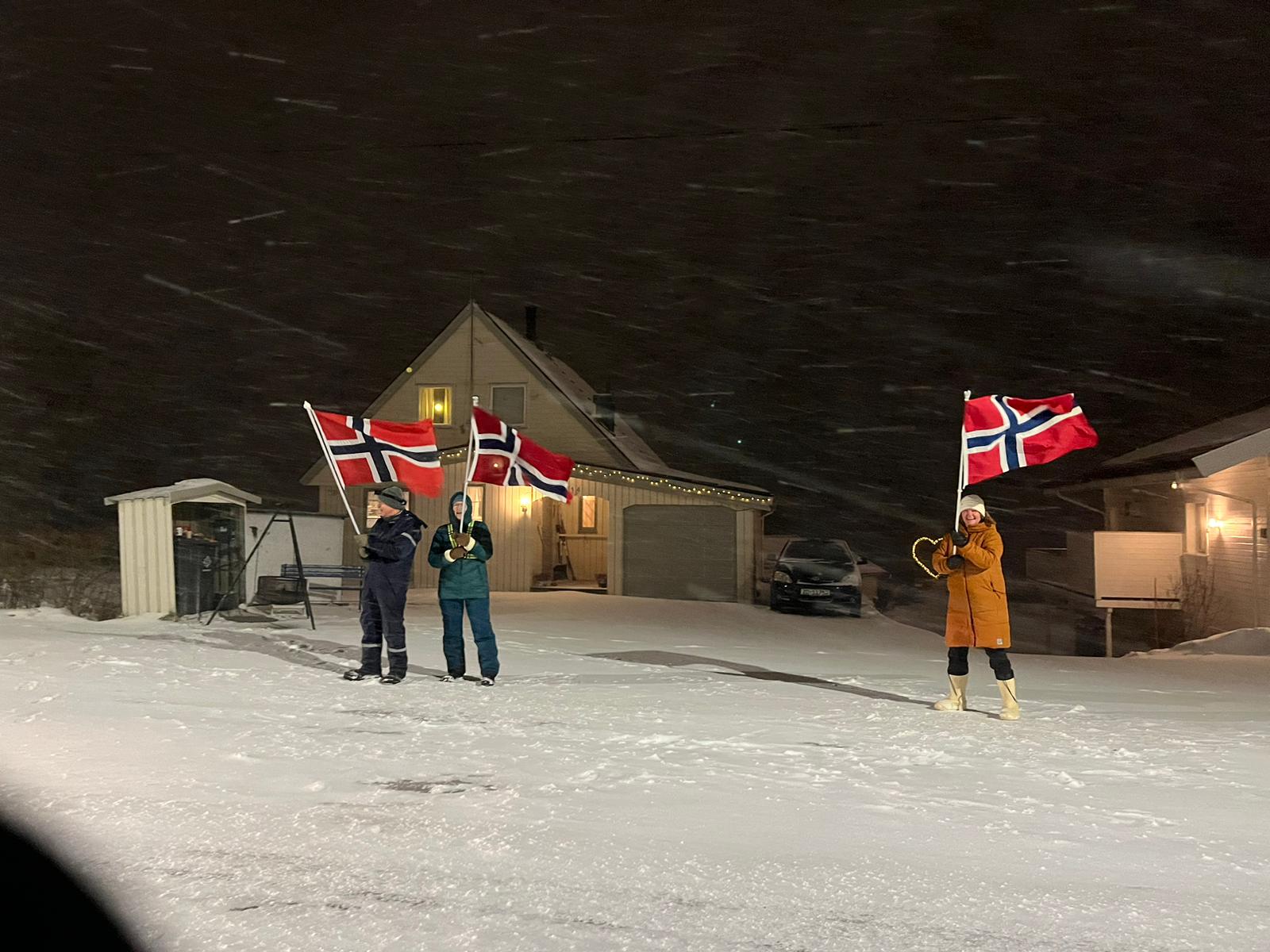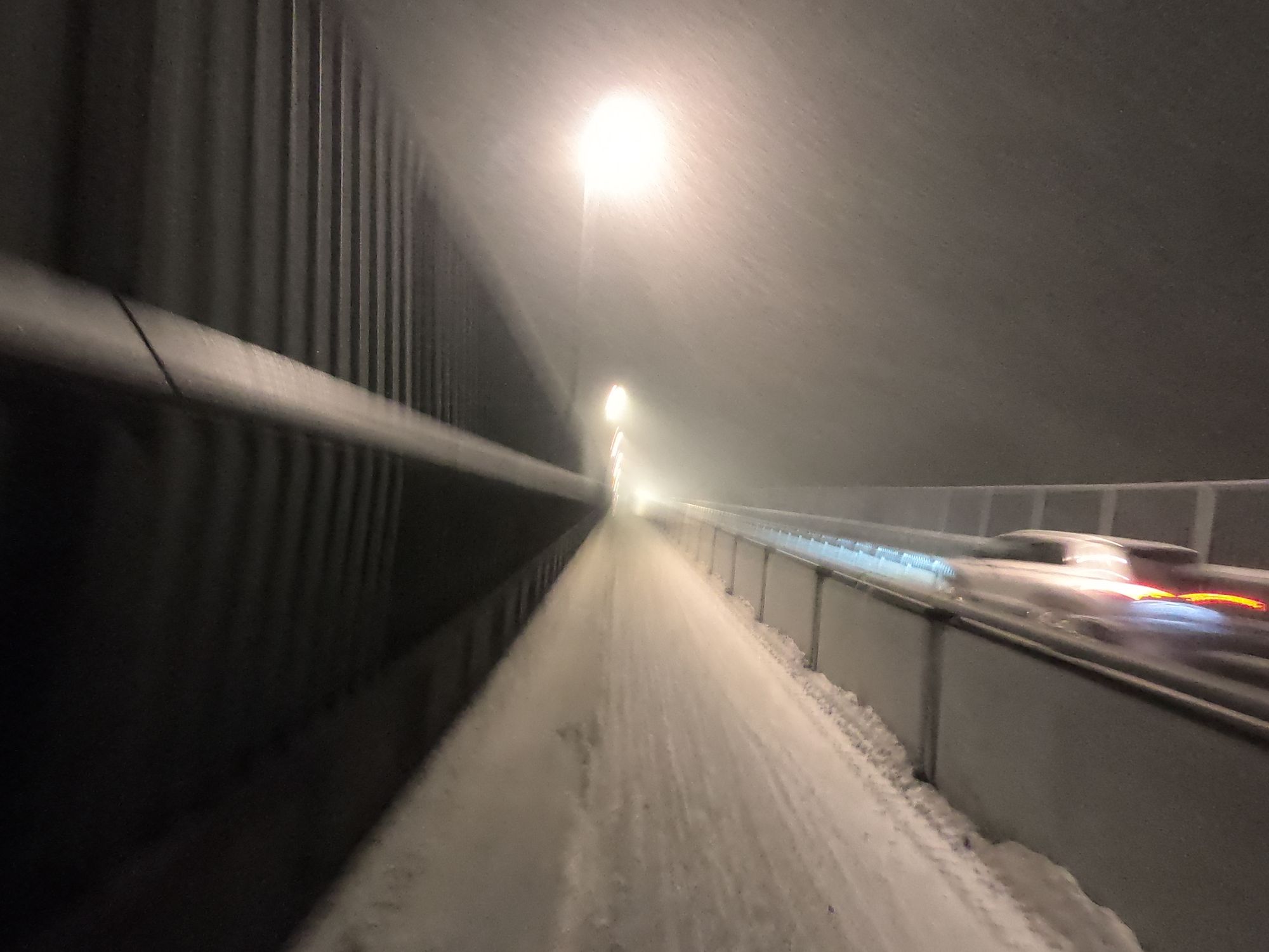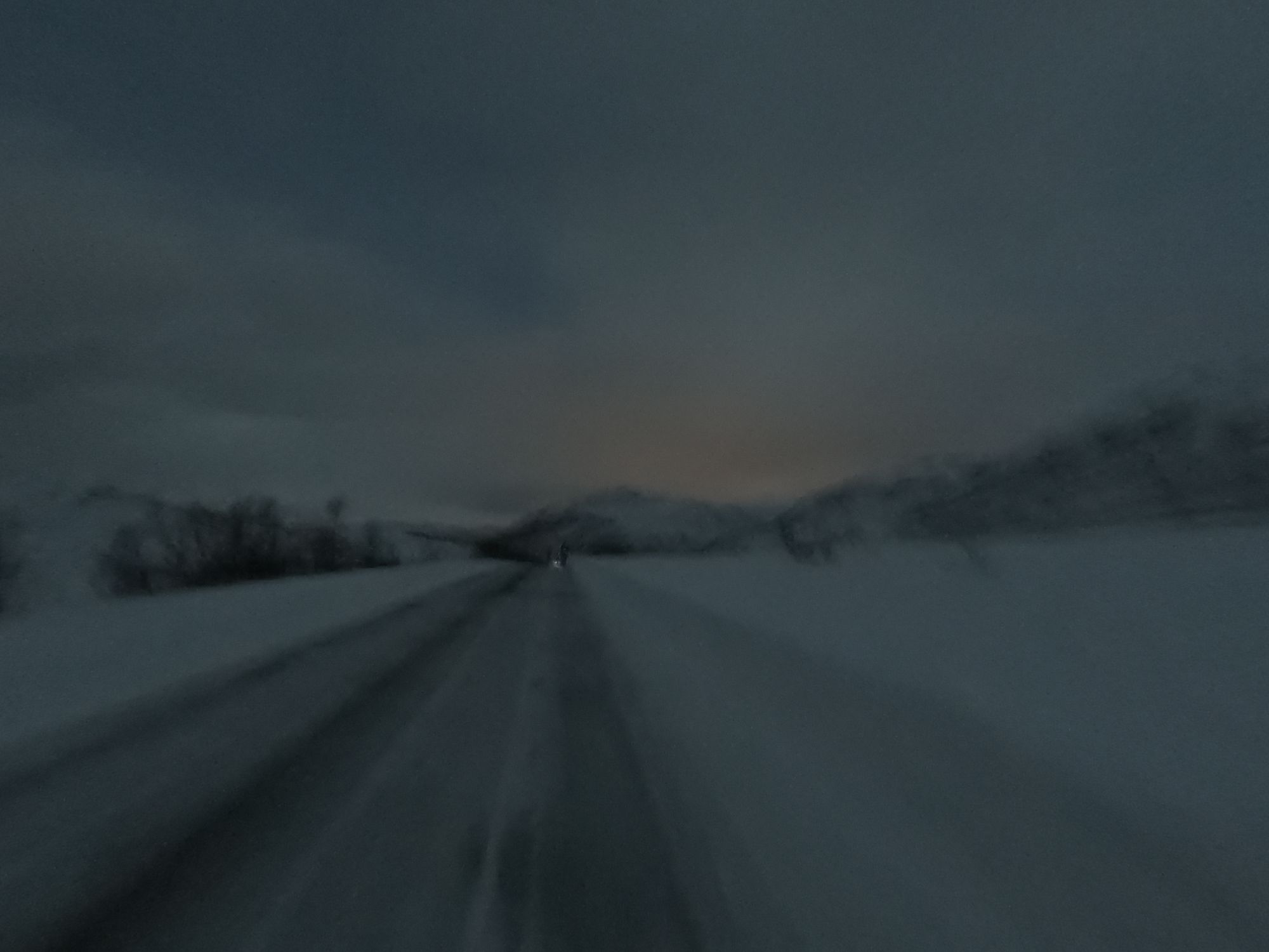 Schon eine halbe Stunde später lief man in die Dunkelheit hinein. Das Feld, des auf 100 Teilnehmer limitierten Wettkampfes, zog sich schnell auseinander. Man war die meiste Zeit allein für sich unterwegs. Nach ein paar Hügeln und Kurven und mit zunehmender Dunkelheit wurden die Bedingungen durch einsetzen Schneefall und Winden aus allen Richtungen immer rauer. Da nebenher die Landschaft zu fotografieren keinen Sinn mehr machte, konnte Kalle sich voll und ganz aufs irgendwie in Bewegung zu bleiben konzentrieren. Das Gesicht wurde mit einem Schall geschützt und ein zweites Paar Handschuhe über die dünneren halfen das zunehmende Frieren zu verzögern. Ziemlich genau nach der Hälfte der Strecke bog man wieder in die Zivilisation ein. Ab hier ging es über die Nebenortschaften auf einem gut beleuchteten Radweg entlang in Richtung Tromsø. Nach ca. 32 km ging es schließlich über die Sandnesssundbrua, welche mit einer Höhe von 41 Metern und einer Länge von 1,2 km die höchste Brücke in Tromsø ist. Kreuzfahrten erleben hier ihren Höhepunkt. Doch die cruisen schön gemütlich unten durch während die Läufer nach schon über 3 Stunden Kampf in den Beinen jetzt bei Blizzard artigen Windböen und starken Schneefällen oben drüber laufen mussten. Augen zu und drüber, denn durch den eiskalten Wind drohten die tränenden Augen trotz dem Schutz einer Brille zu gefrieren.