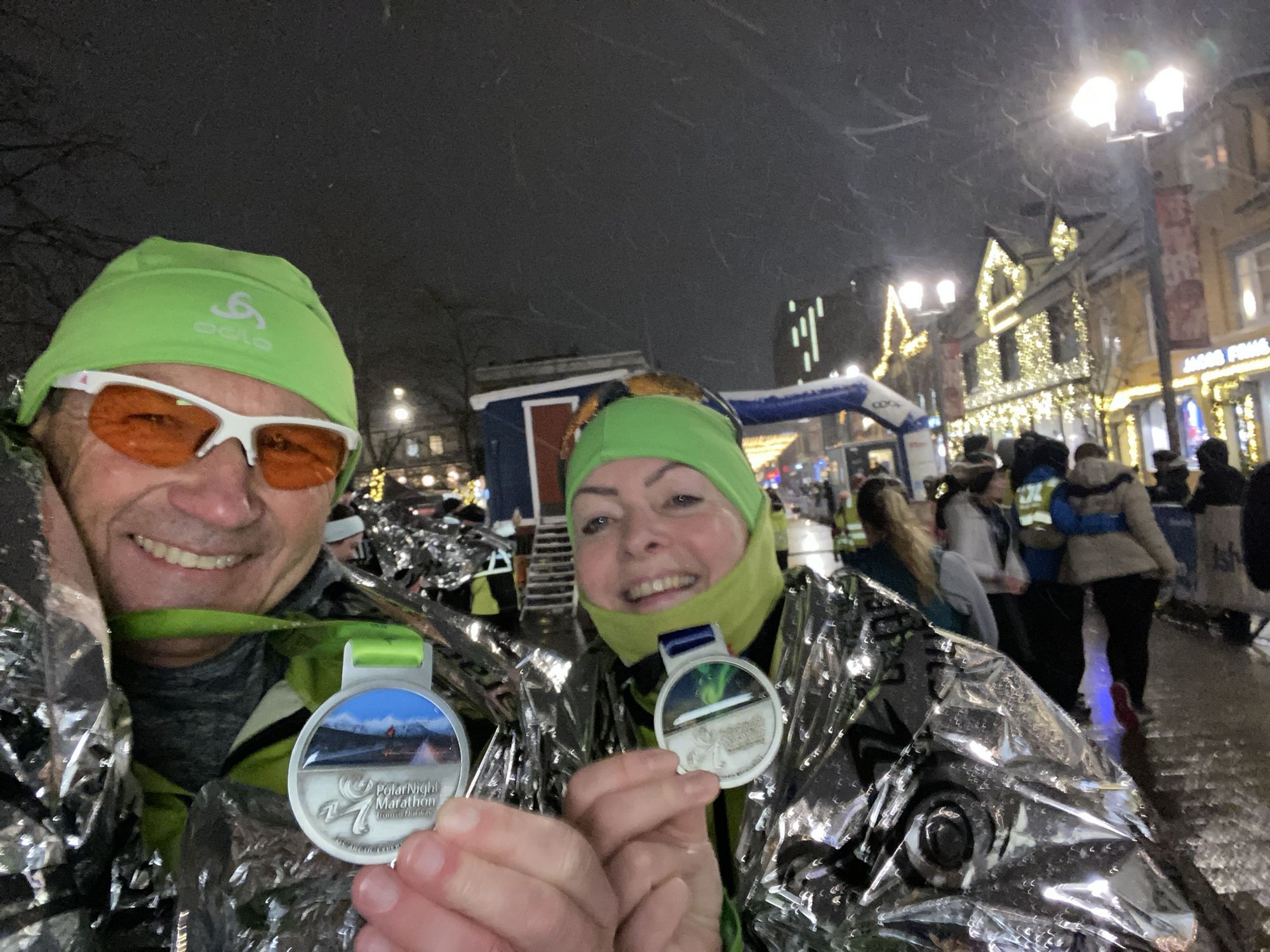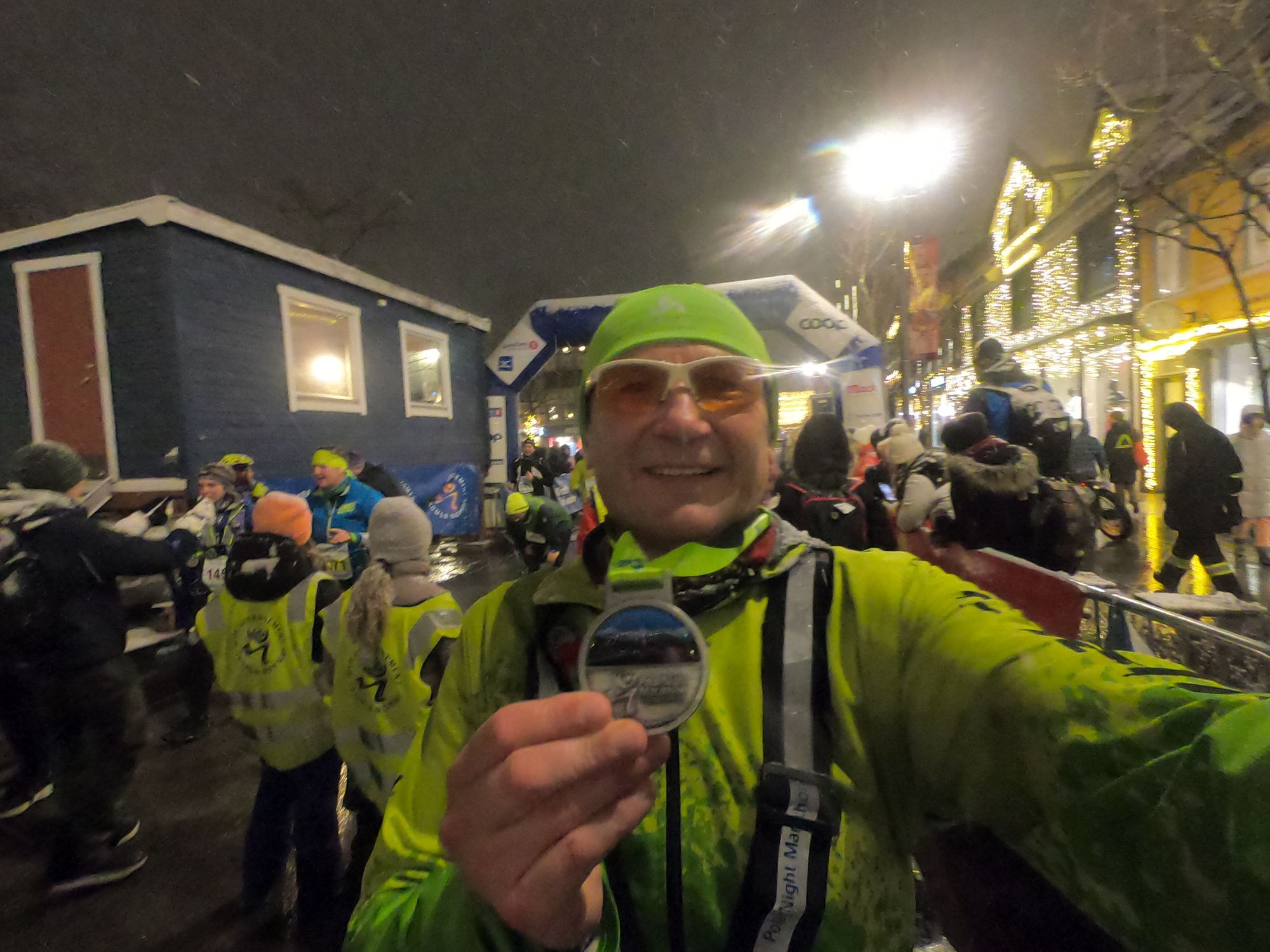 Während die Marathon Distanz erst zum zweiten Mal auf dem Programm stand, feierte der Halbmarathon sein 20-jähriges Jubiläum. Die Strecke führte vom Zentrum in Tromsø hinaus bis zum Flughafen und wieder zurück. Hier war es zum Start um 15:00 Uhr gefühlt bereits mitten in der Nacht. Auch dieser Lauf war mit 850 Teilnehmern komplett ausgebucht. Nach einem kurzen gemeinsamen Aufwärmprogramm ging es auch schon los aus der noch weihnachtlich geschmückten Innenstadt hinaus in Richtung Flughafen. Wie schon oben beschrieben setzte heftiges Schneetreiben und ein eisiger Wind ein. Die Strecke war gut ausgeleuchtet und allesinallem auch gut laufbar. Andrea lief zunächst mit einer Bekannten aus der gemeinsamen Reisegruppe los, fand einen guten Rhythmus und setzte sich dann nach wenige Kilometern nach und nach ab. Bis zum Wendepunkt ging es leicht bergab, was aber auch bedeutete, dass es auf dem Rückweg die letzten Kilometer eben wieder bergauf gehen musste. Andrea kämpfte sich bei eisigem Gegenwind und Schneefall und unter motivierenden Anfeuerungsrufen von zahlreichen Zuschauern, die bei diesen Bedingungen am Rande ausharrten, Kilometer für Kilometer zurück bis zur langen Zielgeraden. Der Zieleinlauf war dann purer Genuss. Andrea finishte ihren Abenteuerlauf in einer Zeit von 2:33:06 Std. Etwas durchgefroren aber völlig happy ließ sie sich ihre verdiente Finisher Medaille um den Hals hängen.