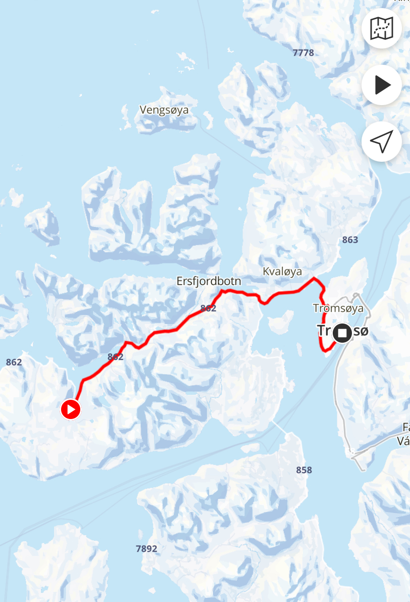 Am Samstag war es dann so weit. Kalle und 99 weitere Lauf-Abenteurer wurden am späten Vormittag mit dem Bus zum Start des Marathons transferiert. Dieser lag 40 Kilometer außerhalb von Tromsø, auf einer vorgelagerten Insel in Kjattfjord, an der abgelegenen Außenküste, irgendwo bei den Eisbären und Trollen. Der Marathon war eine One-Way Strecke, entlang an Fjorden, über ein paar Hügel zurück in die Stadt.