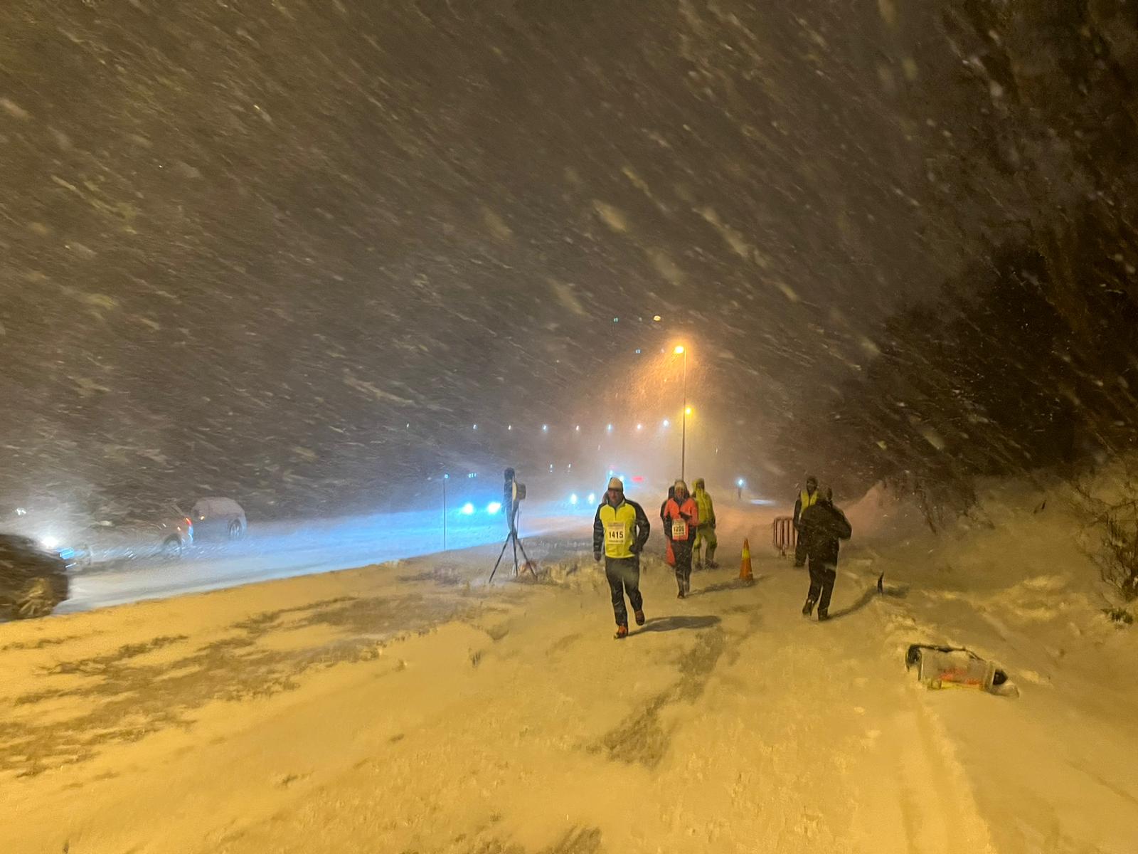 Am Ende der Brücke traf man auf die Halbmarathon Läufer, die dort ihren Wendepunkt hatten. Jetzt waren es noch gute 8 Kilometer. Doch auf diesen 8 km waren nochmal fordernde 150 Höhenmeter zu bewältigen. Der immer mehr mit Schnee bedeckte Boden erschwerte das Laufen zusätzlich. Es waren die Bedingungen, mit denen hier gerechnet werden musste. Kalle konnte hier auf seine jahrelange Erfahrung zurückgreifen, fand einen guten Rhythmus und zog es bis zum Zieleinlauf durch. Mit einer Laufzeit von 3:56:03 Stunden lief er ziemlich erschöpft auf Rang 38. der Gesamtwertung uns als Erster seiner Altersklasse M60 ins Ziel.