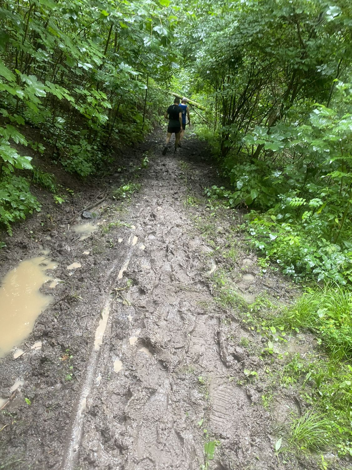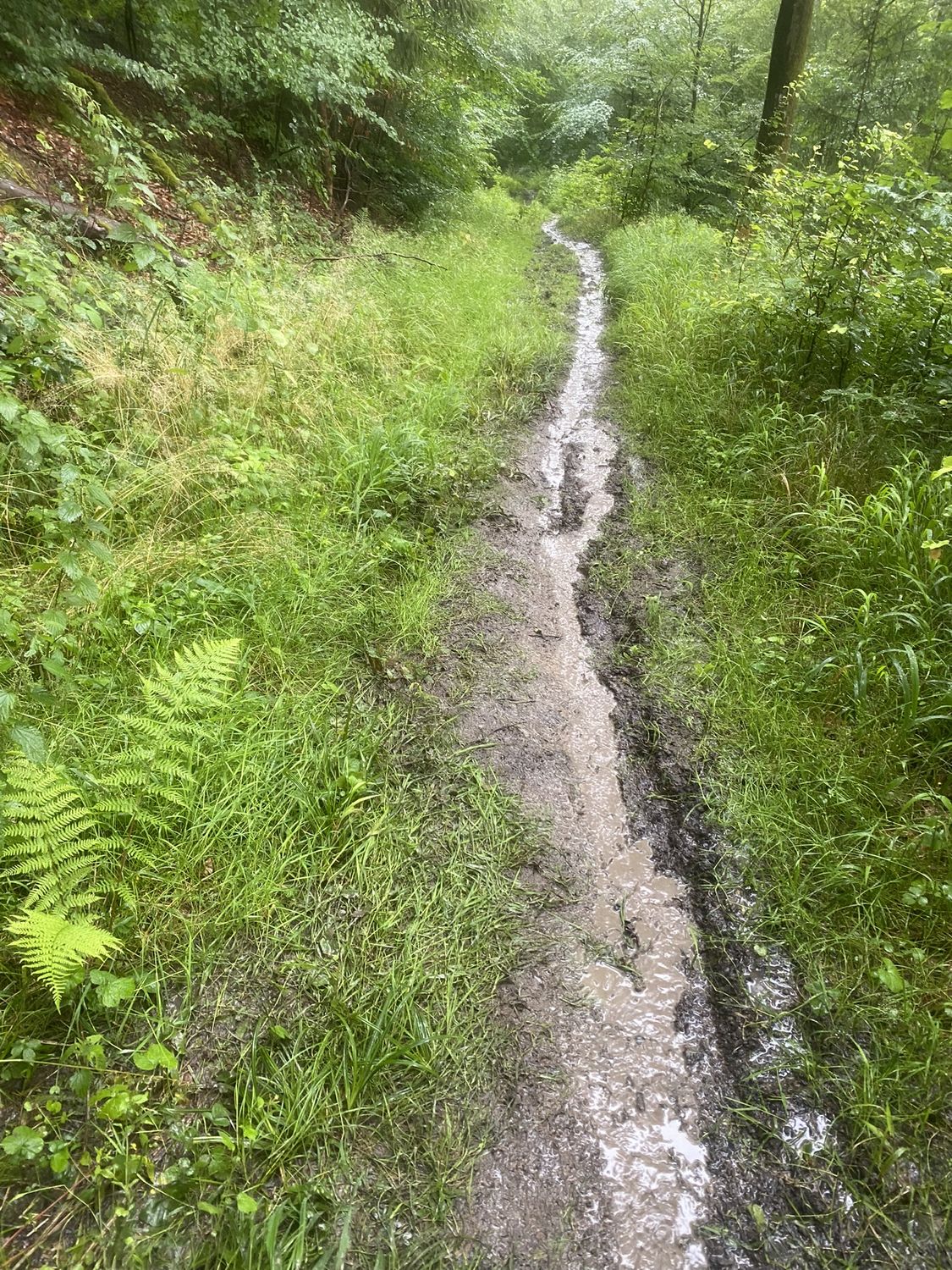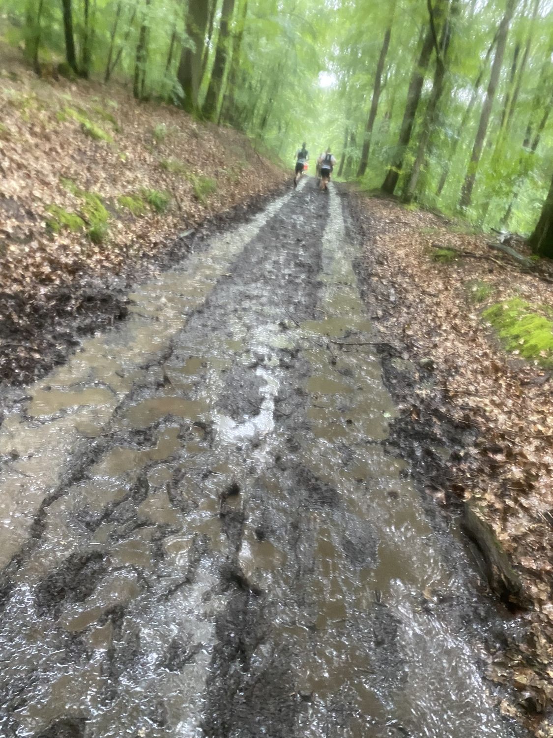 Wir geübten Trailrunner aus der topologisch ähnlichen Schurwaldregion stuften das Profil dann als eher einfach und gut laufbar ein. Wäre es vielleicht auch gewesen, doch der Wettergott hatte ganz anderes im Sinn. Unmittelbar nach dem Start des Ultras über die 50km zog ein heftiges Gewitter mit den aktuell bekannten Starkregengüssen auf. Die Wege füllten sich schnell mit Wasser und die schmalen Trails wurden zu schlammigen Bächen. Das Gewitter verzog sich dann wieder, doch es regnete durchweg weiter. Wer sich vor dem Start für einen etwas grobstolligen Trailschuh entschieden hatte, war gut beraten, für alle anderen wurde es zu einer wahren Rutschpartie.