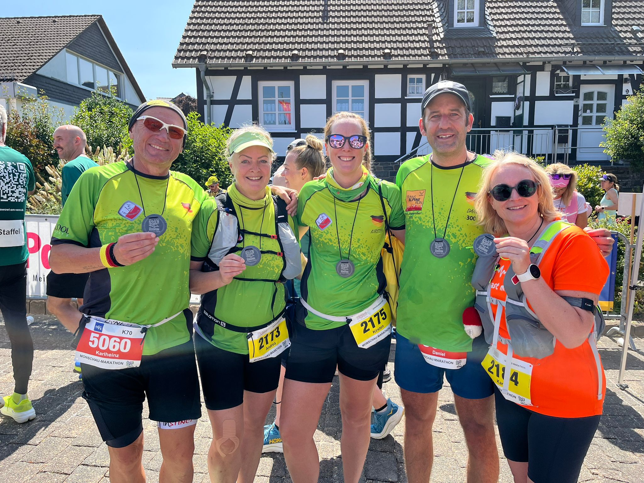 Dani und Kalle liefen nach exakt 7:30 Stunden im vorderen Drittel der 122 gestarteten K70-Teilnehmenden ein. Dani wurde danach als 3. in der AK M45 und Kalle als 2. in der AK M60 geehrt.