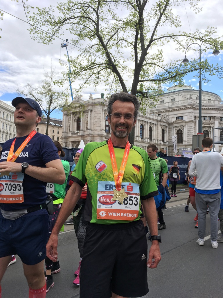 Die Marathonstrecke gleicht einer Stadtbesichtigung, vorbei an der Wiener Staatsoper, am Secessionsgebäude und am Naschmarkt durch das Wiental bis zum Schloss Schönbrunn, durch Wiens bekannteste Einkaufsstraße, die Mariahilfer Straße. Viele der eindrucksvollen Museen, das Parlament, die Universität und die Votivkirche liegen direkt an der Strecke. Über den Prachtboulevard Ringstraße geht es auf die Zielgerade vor dem imposanten Burgtheater. Dort kam Bernd mit einer Zeit von 3:54:13 Stunden nach einem sehr gleichmäßigen Lauf zufrieden ins Ziel.